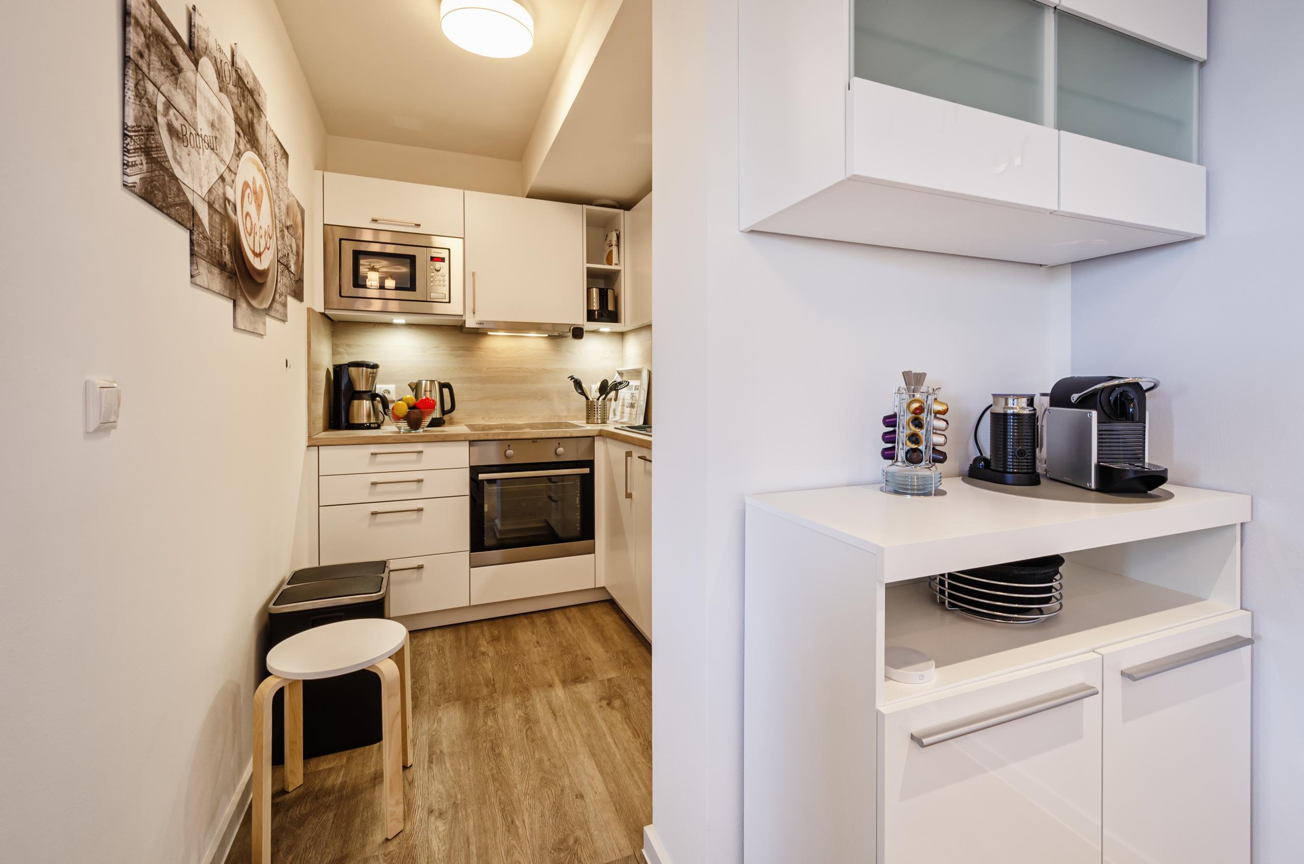 Große bodentiefe Fenster sorgen für viel Licht und ein offenes Raumgefühl. Modernes Design in frischen Farben verbreiten Luxus-Flair. Dieses Apartment ist ein großzügiger offener Raum, der sich unterteilt in Wohn-/Essbereich und separater Küche. Die Küche verfügt über ein Induktionskochfeld, Backofen, Geschirrspülmaschine, eingebaute Mikrowelle sowie einen großzügigen Kühlschrank mit Gefrierfach.