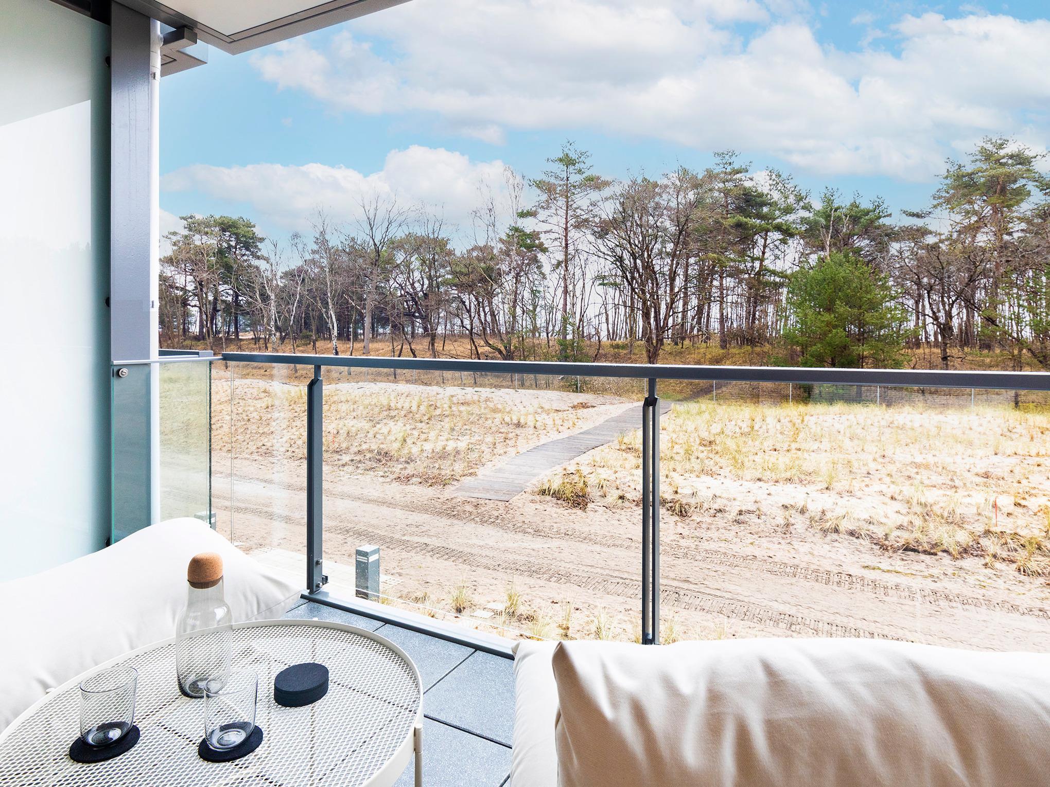 - Terrasse mit Sitzmöglichkeit und Blick Richtung Dünenlandschaft und Ostsee
