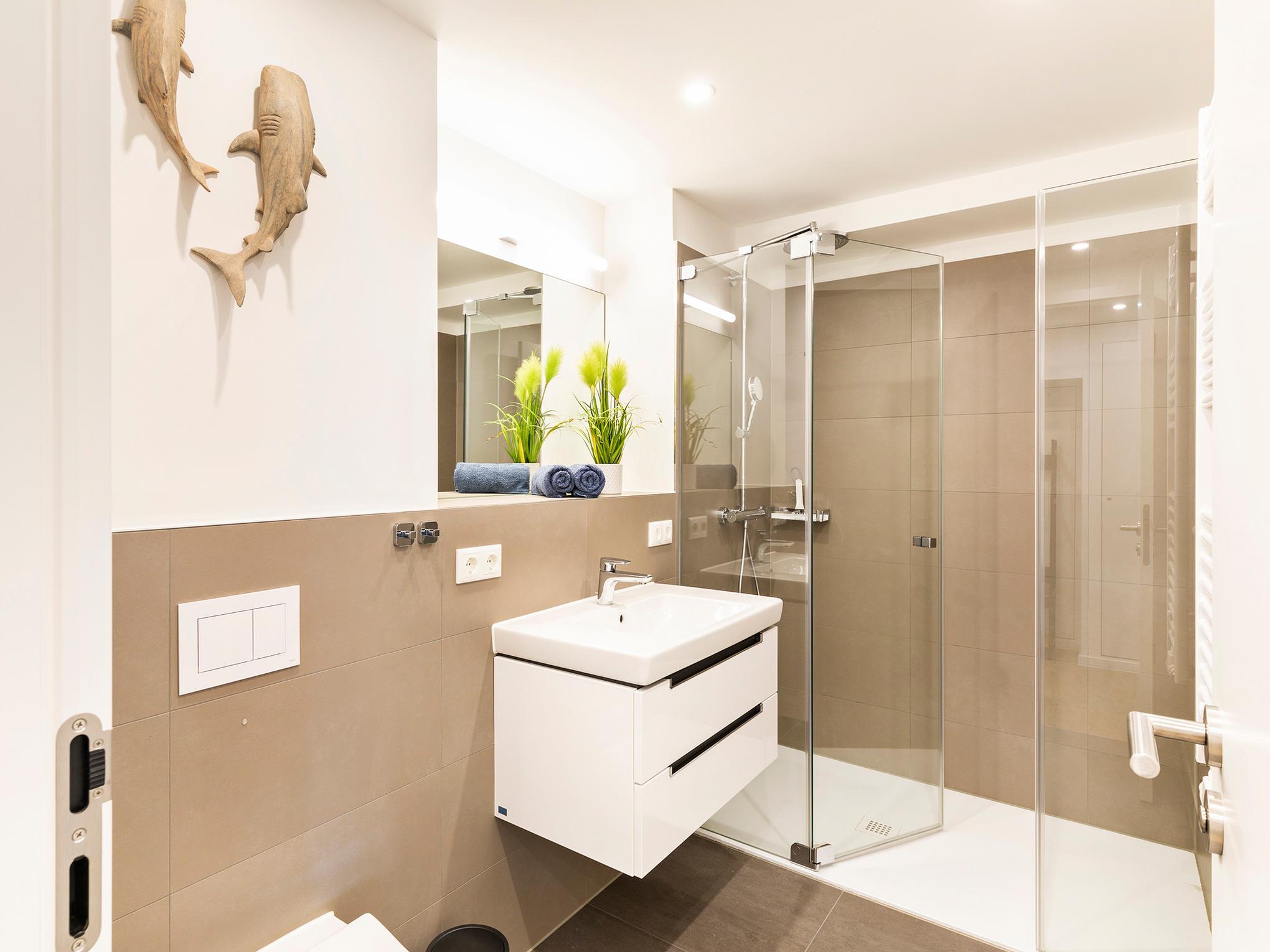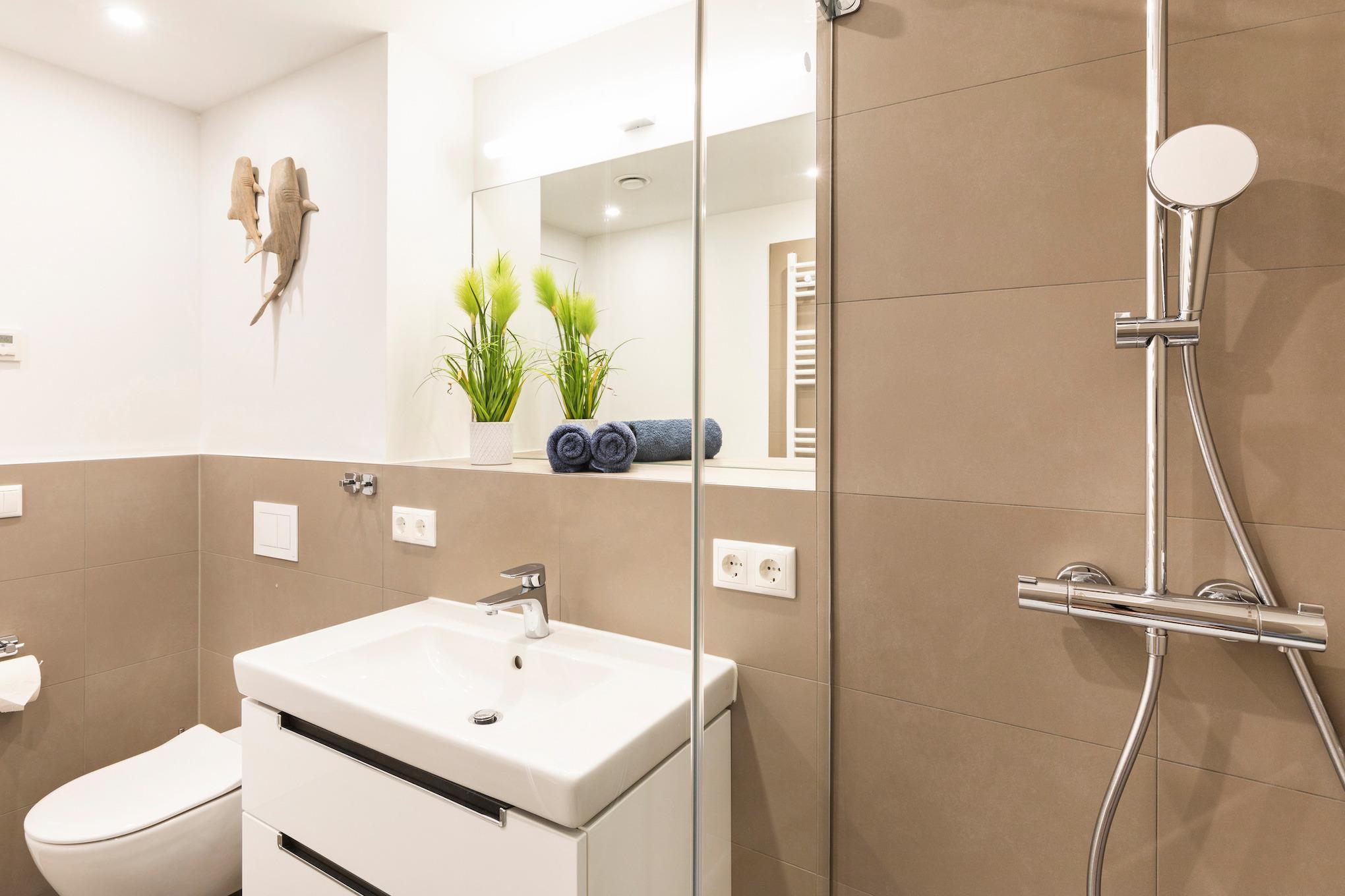 Modernes Ferienappartement in Binz mit Ostseeblick, Balkon, zwei Bädern und E-Ladestation für Pkw.