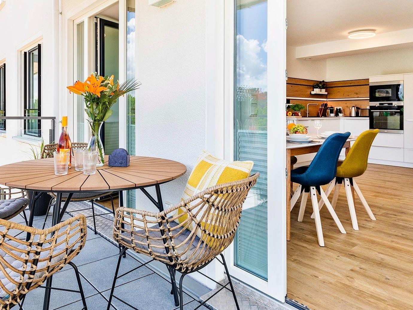 Wohn- und Esszimmer mit offener Küche und Balkon mit Blick in Richtung Ostsee