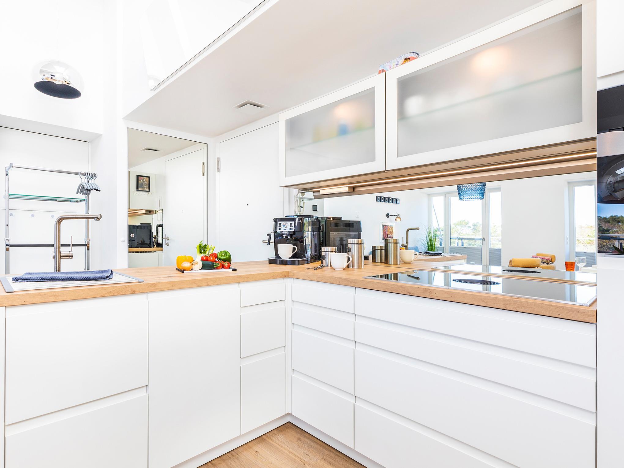 - Einbauküche, voll ausgestattet: Induktionskochfeld, Backofen mit Mikrowelle (Kombigerät), Kühlschrank, Gefrierschrank, Geschirrspüler, Kaffeevollautomat, Milchaufschäumer