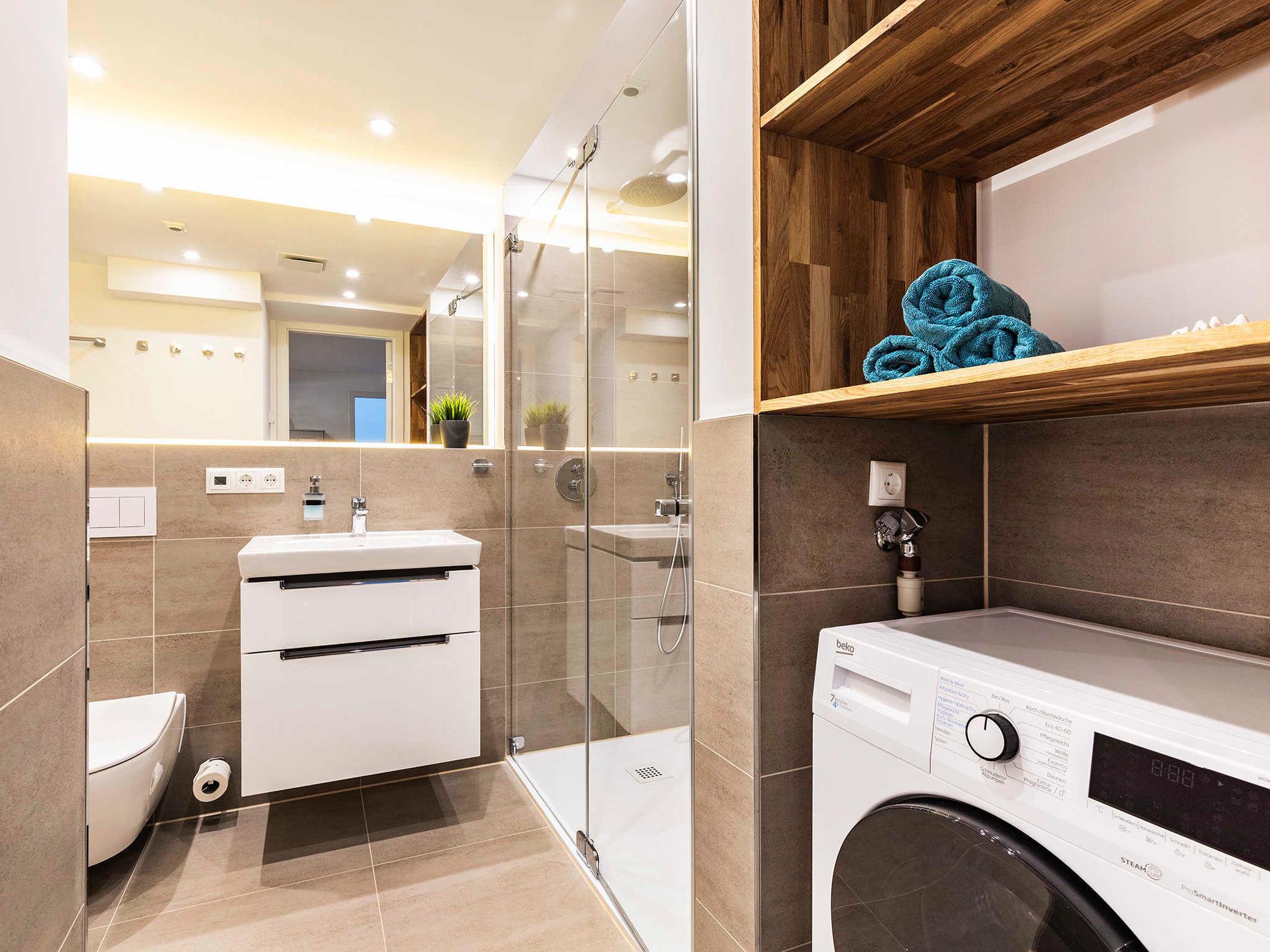 Zwei moderne Badezimmer, gelegen zwischen den Schlafräumen und somit zentral erreichbar, lassen genügend Spielraum zu, um stressfrei in den Tag zu starten - egal ob dabei eine der beiden großen "Rainshower"-Duschen oder gar die Badewanne genutzt wird. Ergänzt wird das große Bad um einen in der Wohnung integrierten Waschtrockner.
