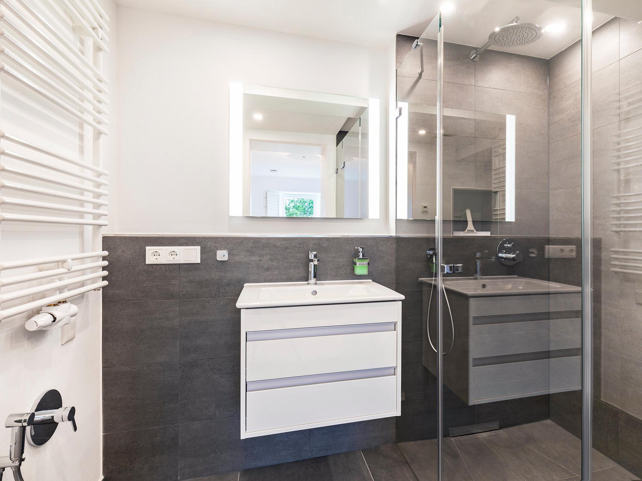 - Badezimmer 1: Regendusche, WC, Badewanne und Föhn