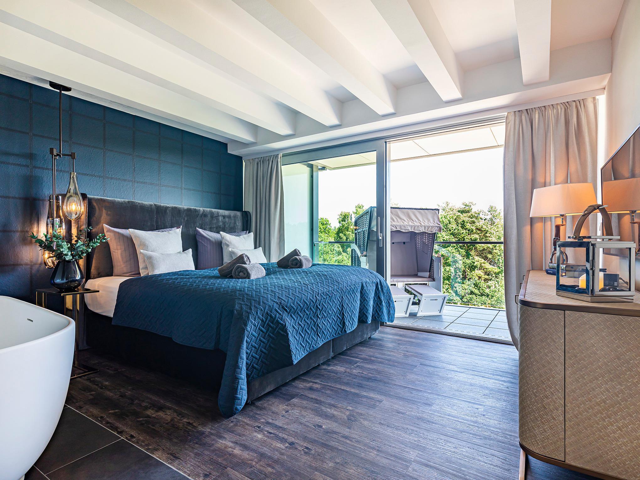 - Schlafzimmer 1: Doppelbett (180x200), Smart-TV, freistehende Badewanne, Zugang zum Balkon