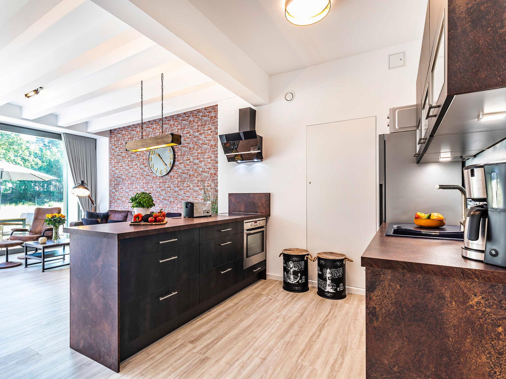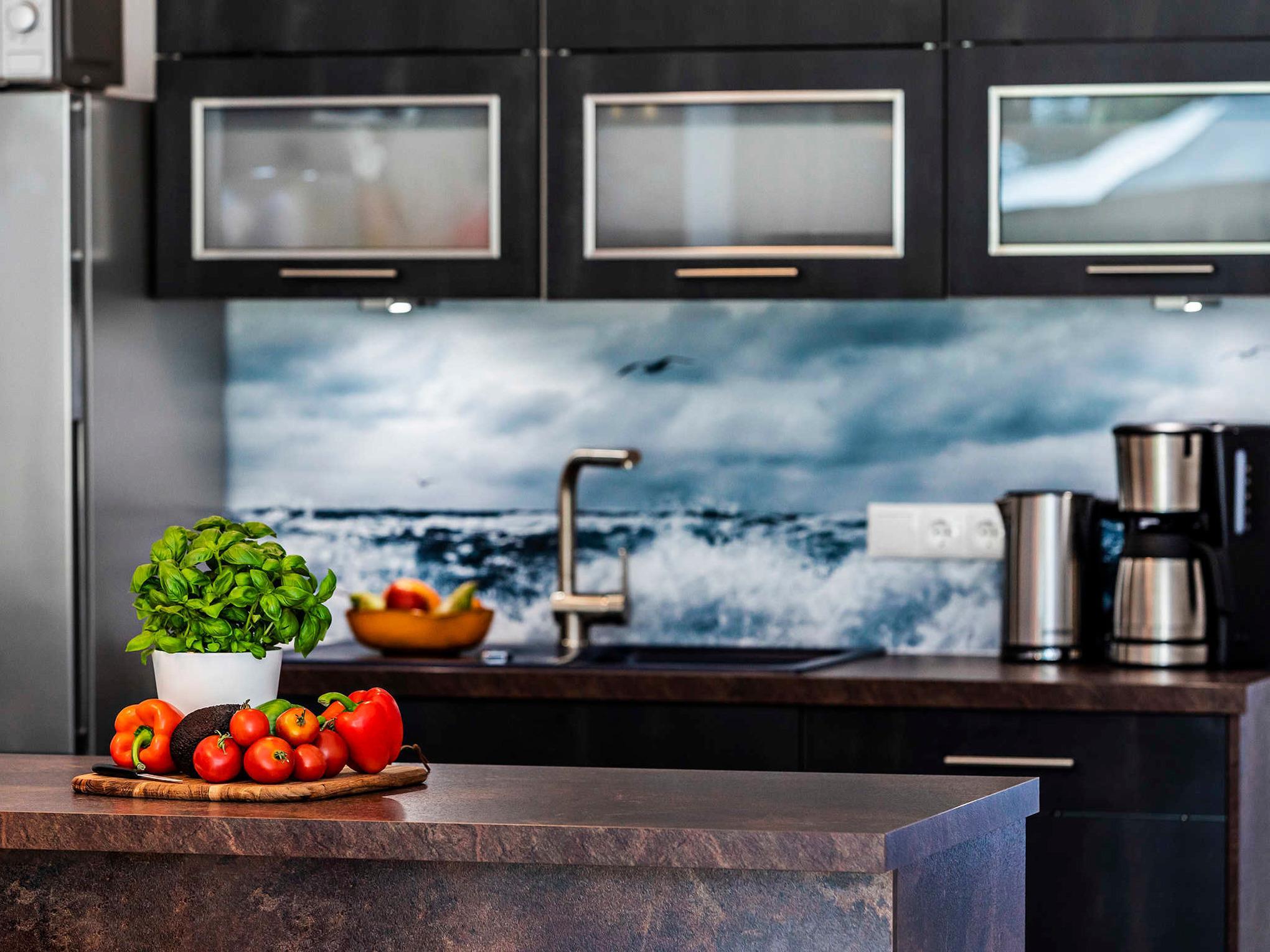 - Küche: offene Küche, Kühlschrank, Backofen, Spülmaschine, Geschirr/Besteck, Kochutensilien, Toaster, Mikrowelle, Filterkaffeemaschine und Kapsel-Kaffeemaschine (Cafissimo)