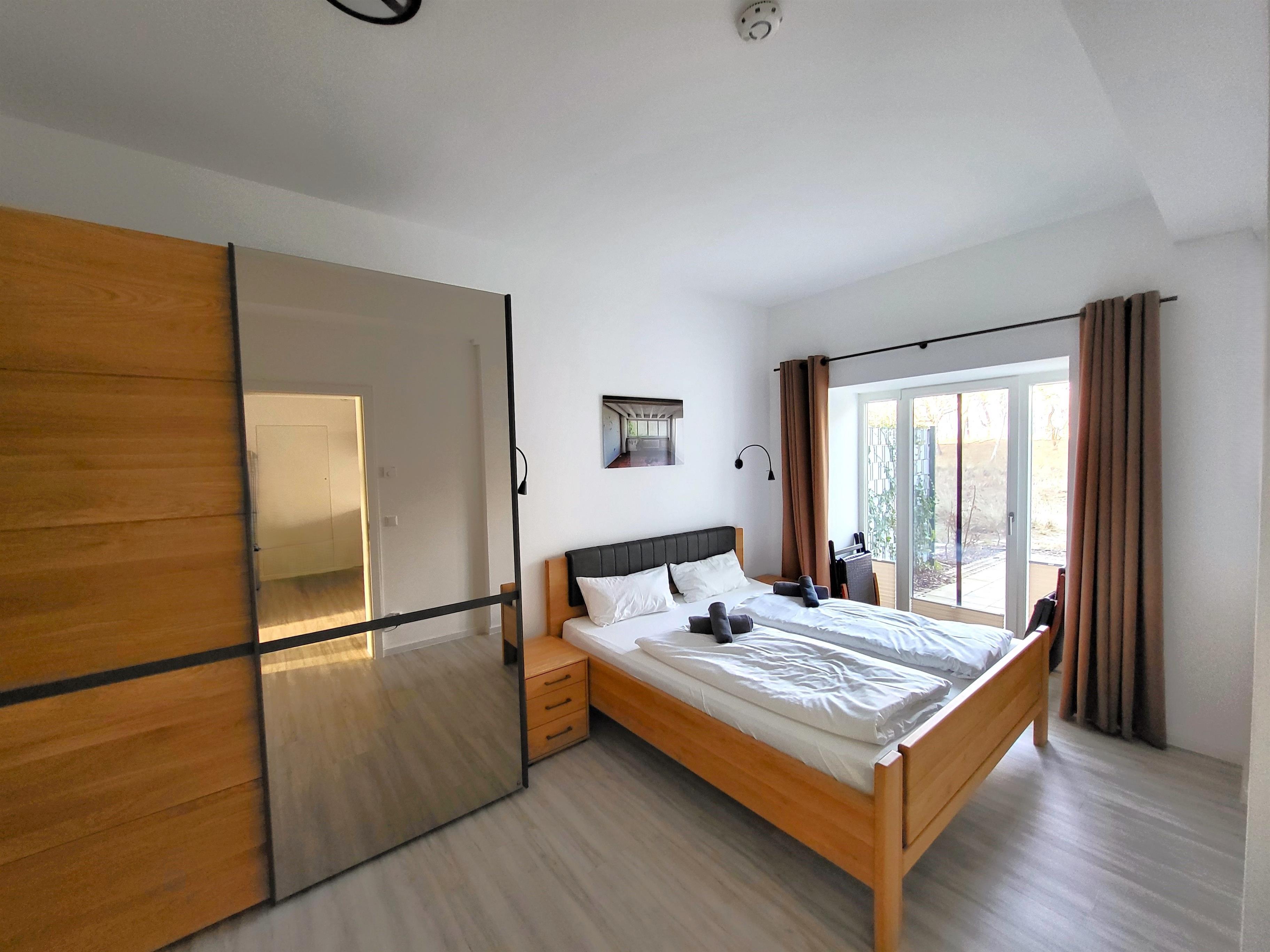 - Schlafzimmer 1: Doppelbett (180x200), Kleiderschrank, Smart-TV, Zugang Terrasse