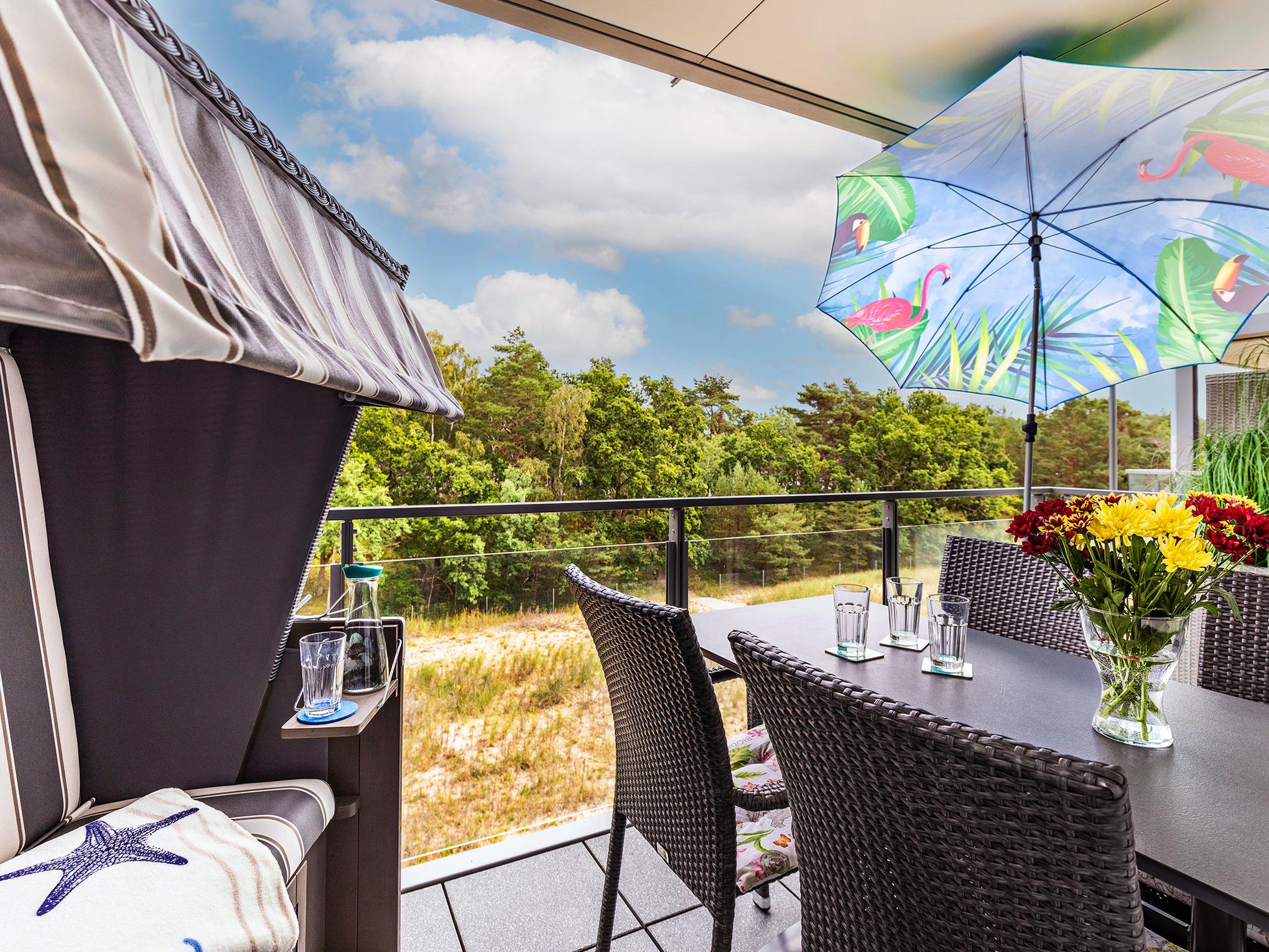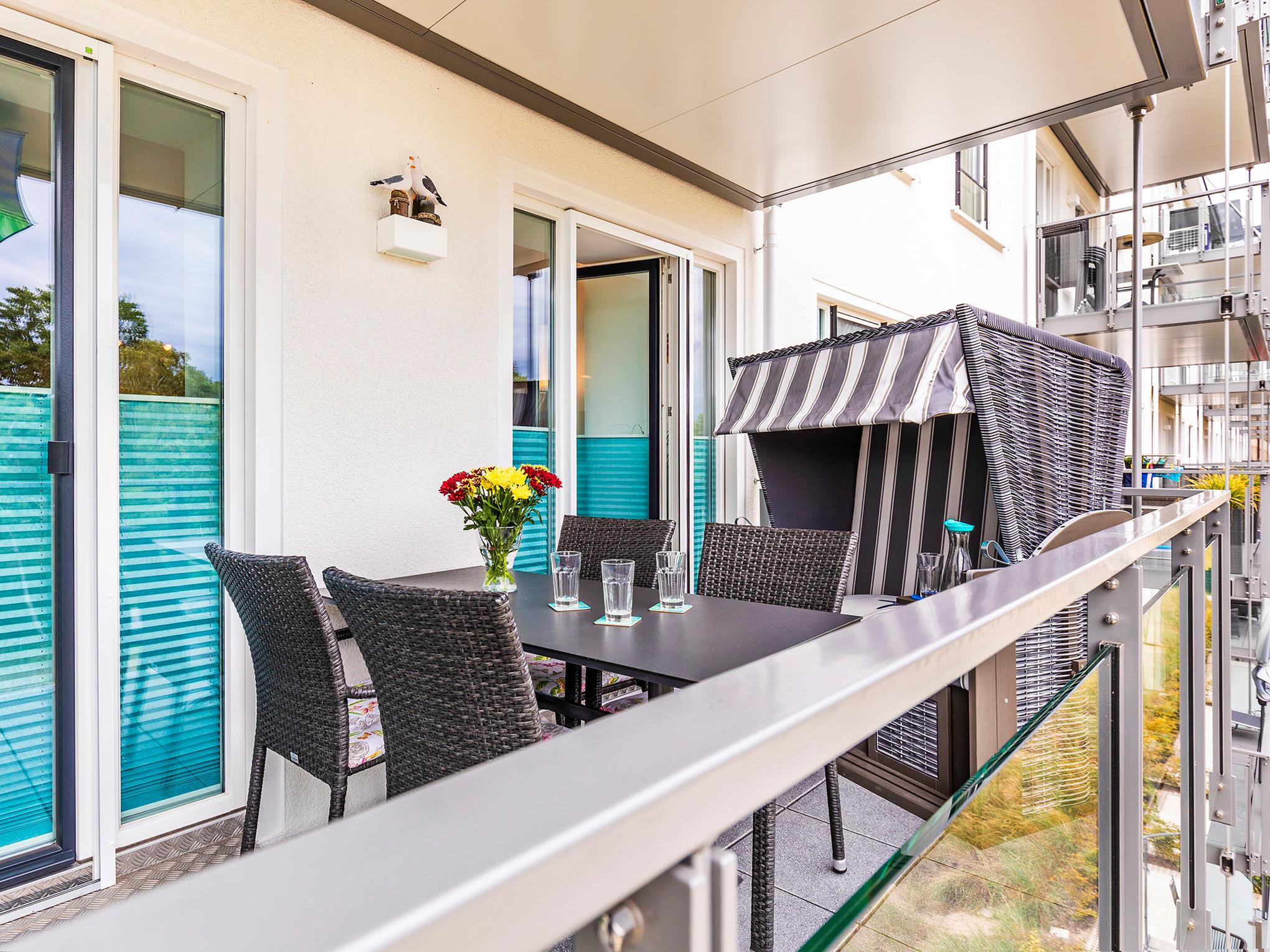 Moderne Ferienwohnung in Prora mit Meerblick, Balkon, Strandkorb und direktem Strandzugang.