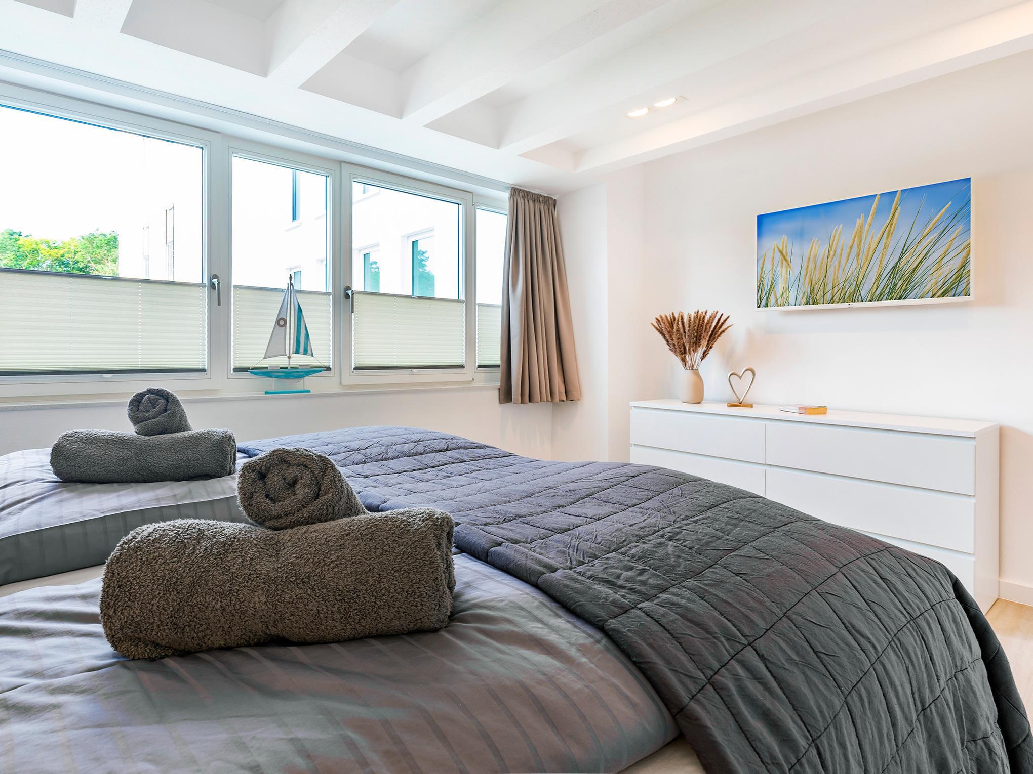 Im zweiten Stockwerk der Ferienwohnung befinden sich zwei Schlafzimmer. Beide Schlafzimmer sind mit einem Doppelbett (180x200) und einem TV ausgestattet. Vom ersten Schlafzimmer aus haben Sie zudem Zugang zum Balkon und einen atemberaubenden Blick auf das Meer. Das Badezimmer verfügt über eine Dusche und eine Badewanne. Ein Internetanschluss (WLAN) ist in der Ferienwohnung inklusive. Die Wohnung ist zudem mit einer Fußbodenheizung ausgestattet, die für eine angenehme Wärme sorgt. Ein direkter Strandzugang ermöglicht es Ihnen, schnell und bequem ans Meer zu gelangen.