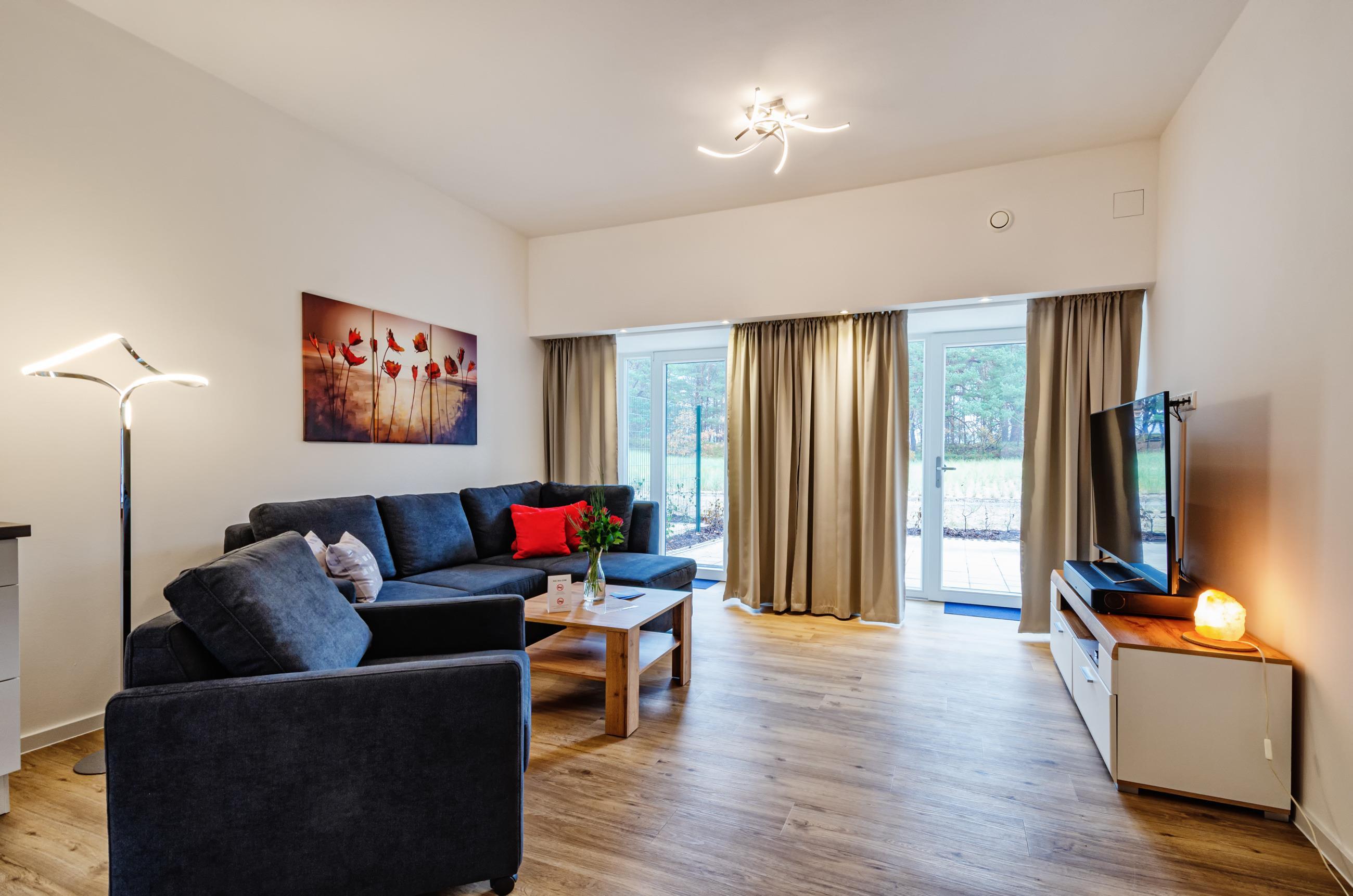 Gemütliches Erdgeschoss-Apartment in Prora mit Terrasse und Meerblick, Sauna und E-Ladestation.