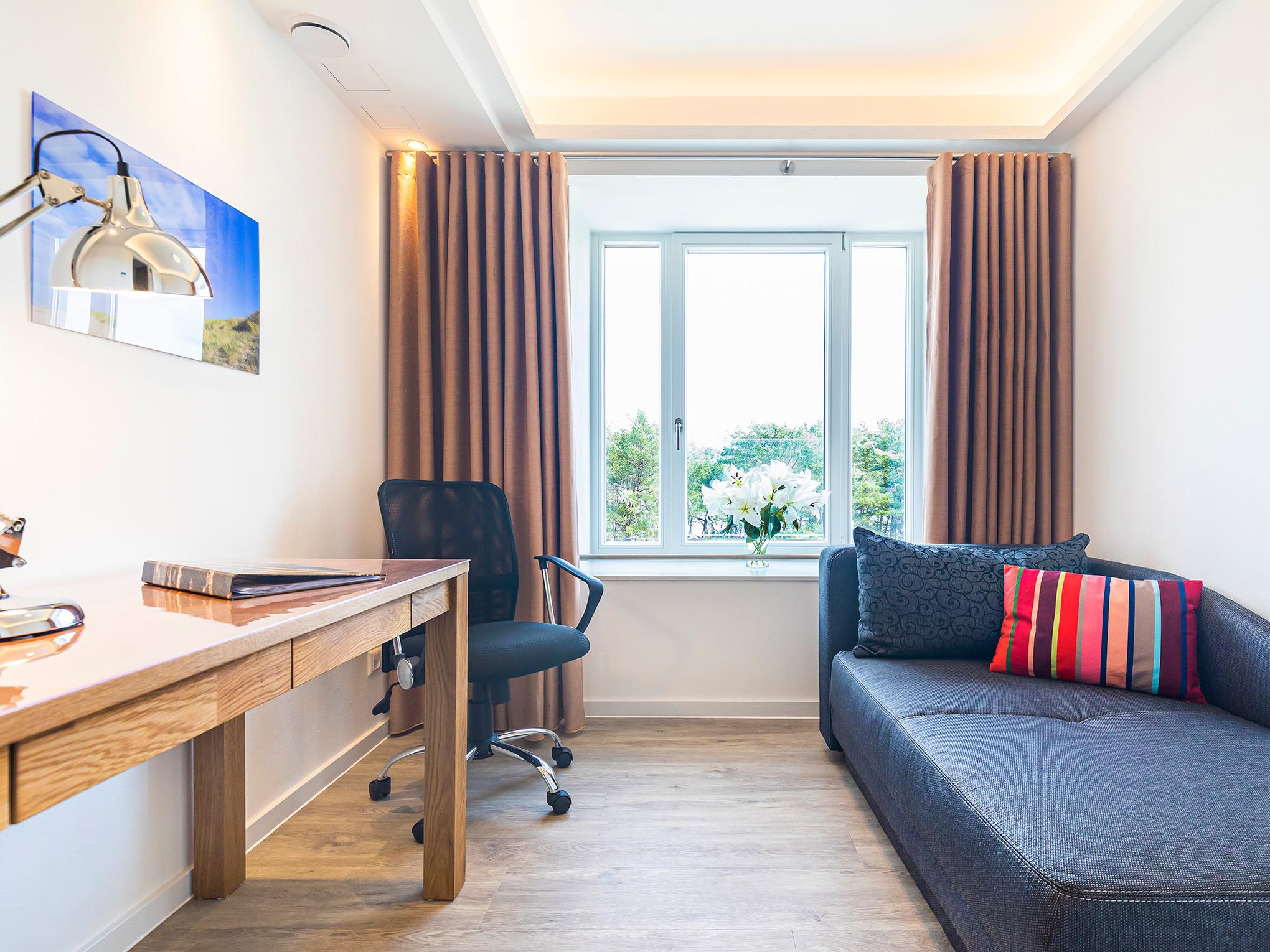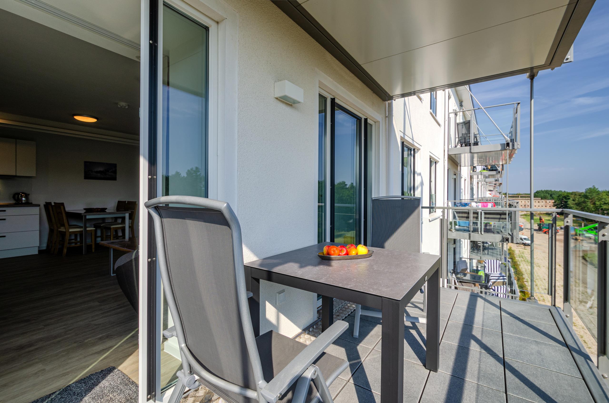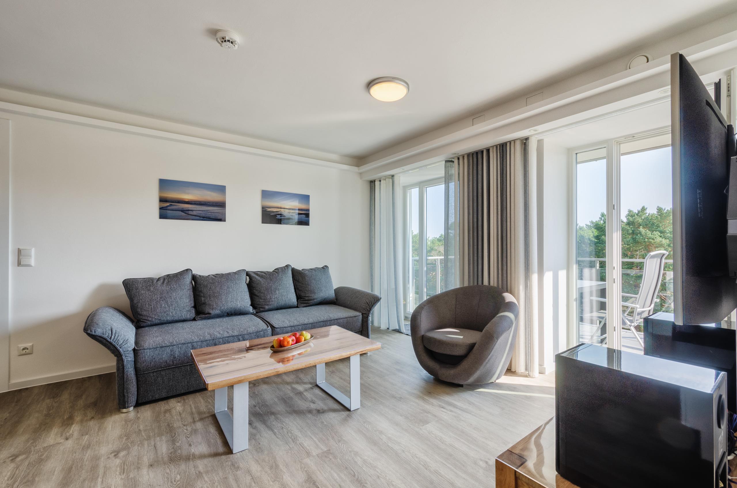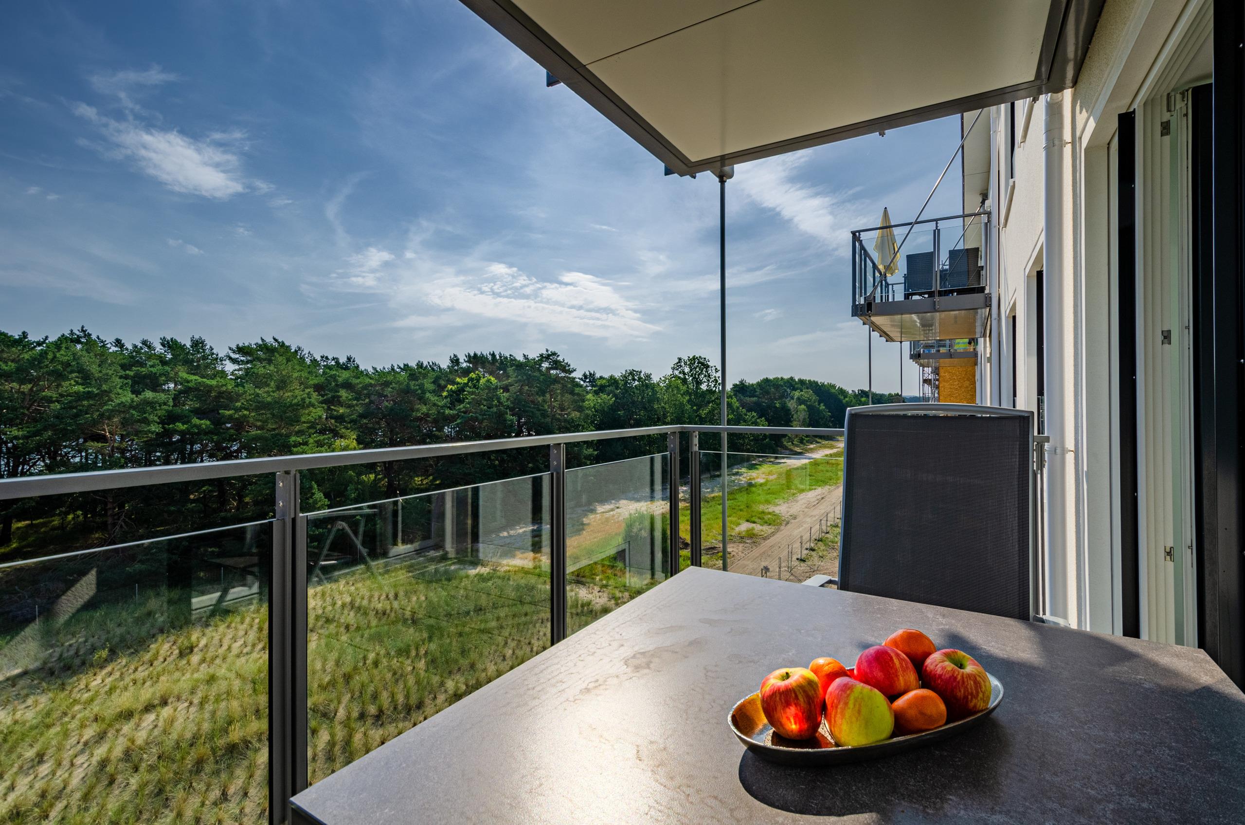 Moderne Ferienwohnung in Binz OT Prora mit Meerblick, Balkon, Gemeinschaftssauna und E-Ladestation.