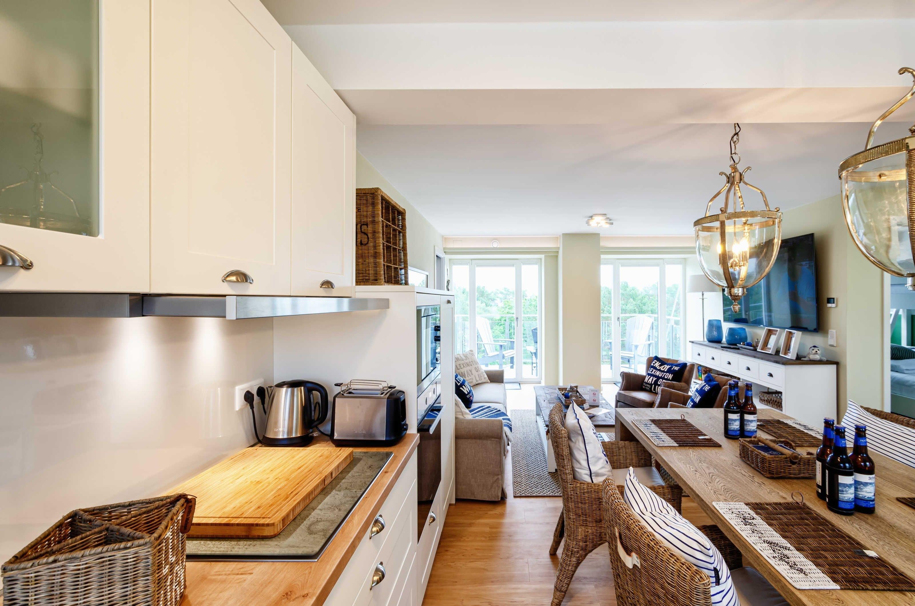Ihre Unterkunft befindet sich im 5. OG des Arkona-Hauses, welches nach erfolgter Renovierung im Mai seine ersten Gäste willkommen heißt. Das 91m² große Apartment mit Platz für vier Personen umfängt Sie mit maritimen Charme: helle Farben, viel Holz und gemütliches Mobiliar im Vintage-Design versprühen US-Ostküsten-Flair im Stil der Hamptons. Ein Glasbalkon bietet Sicht über die Bucht direkt vor Ihrer Haustür. Besonders charmant ist die offene Küche mit Backofen, Geschirrspüler, Kühlschrank und Mikrowelle. Freuen Sie sich auch auf kostenfreies WLAN sowie Flatscreen-TV-Geräte in allen Zimmern. Die zum rauschenden Meer hin ausgerichteten Schlafzimmer sorgen für angenehme Nachtruhe. Zwei edel ausgestattete Bäder bieten weitere Annehmlichkeiten für Ihren Aufenthalt.