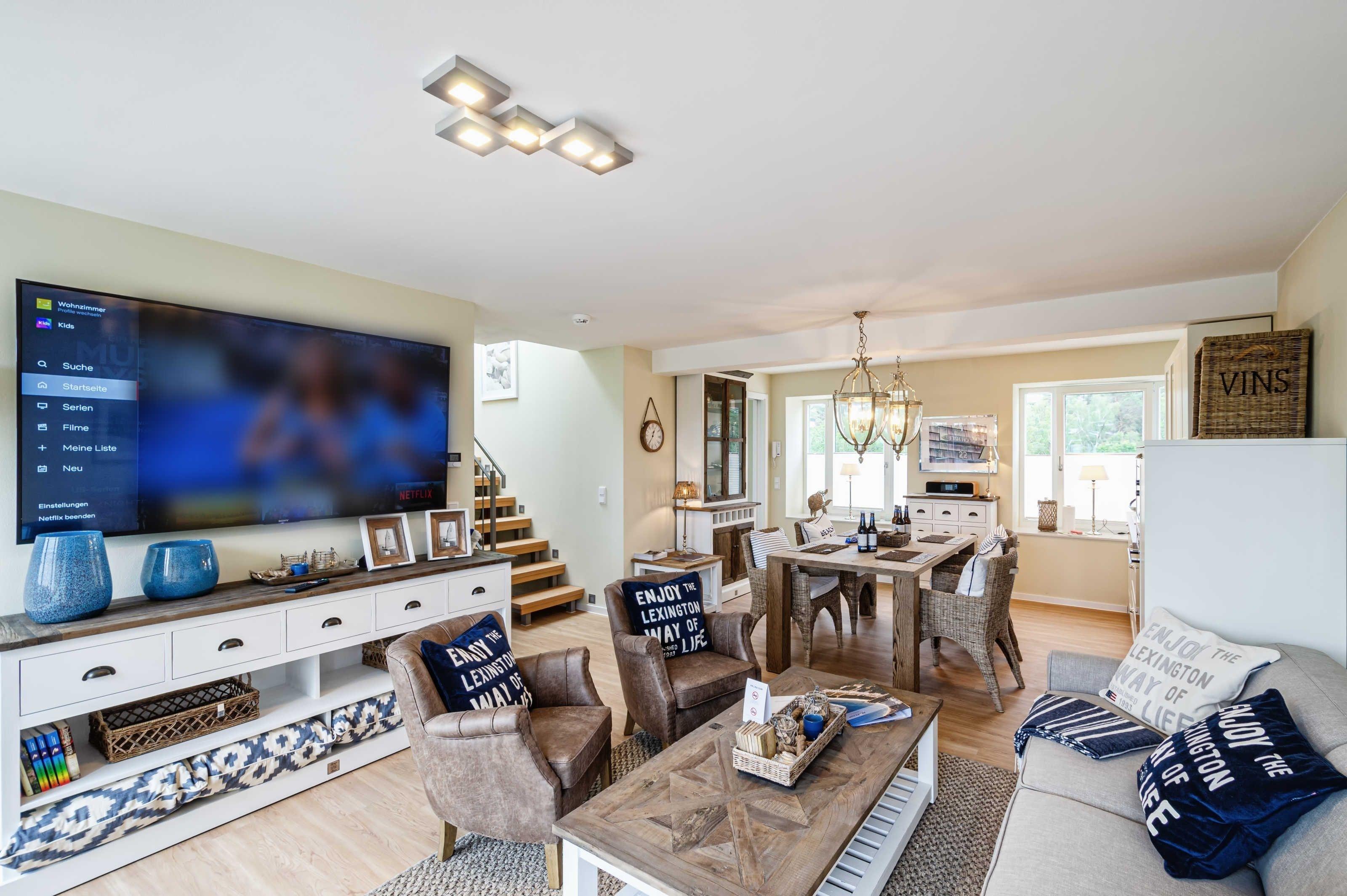 - Wohnbereich/Essbereich: Sofa, TV, Treppenaufgang zur Dachterrasse, Zugang zum Balkon