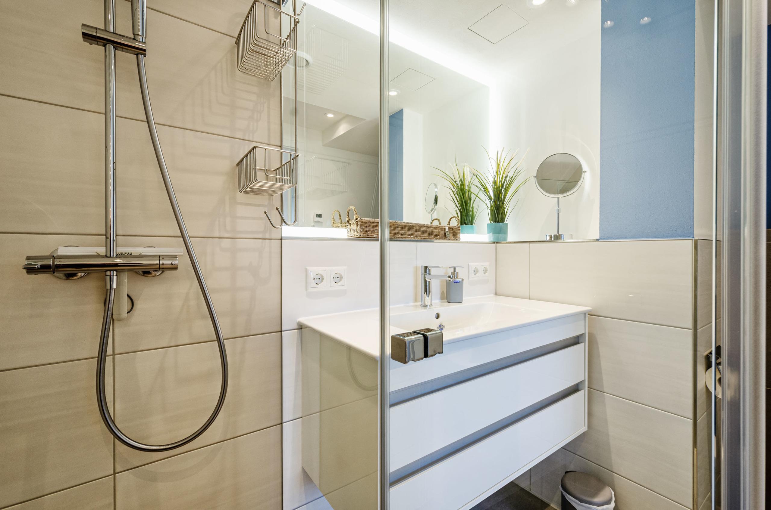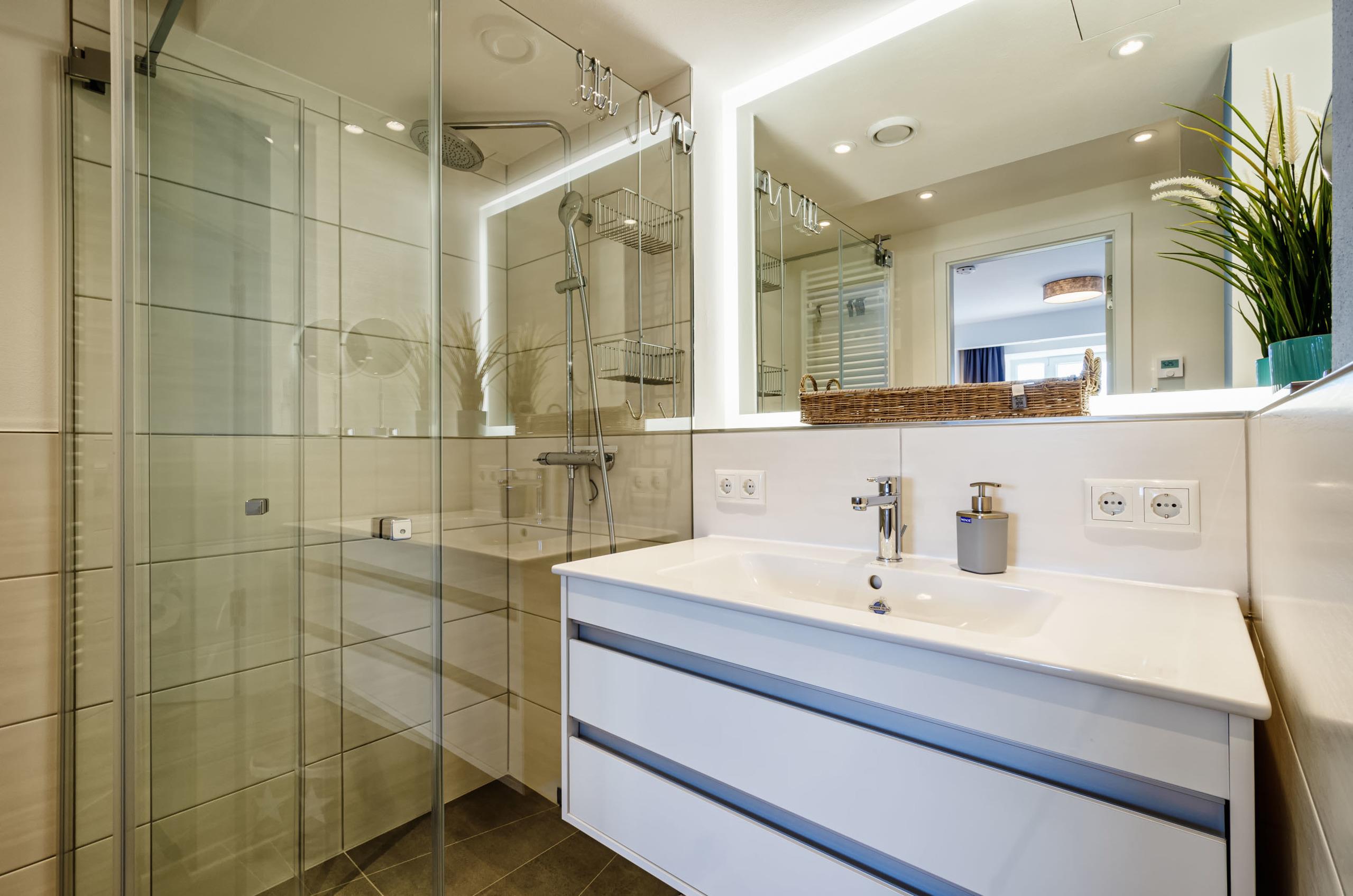 • Tageslichtbad mit ebenerdiger Regendusche, Waschtisch, WC, Föhn & Handtuchheizung