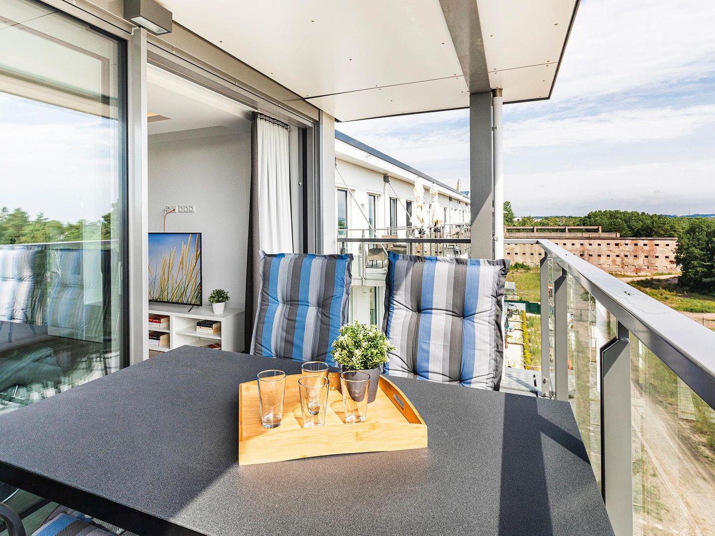 - Balkon mit Tisch und 4 Stühlen, Blick auf das Meer