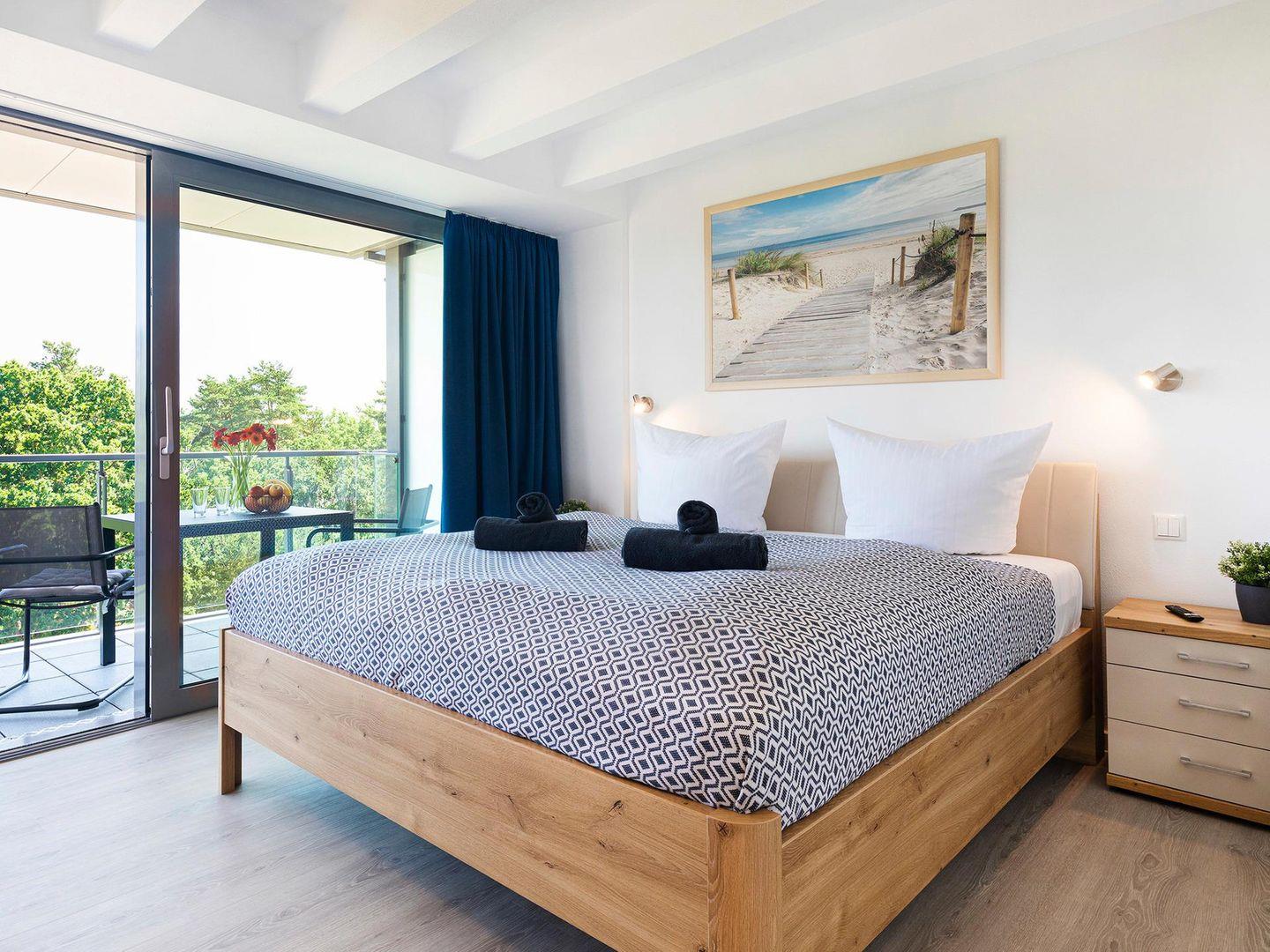 - Schlafzimmer 1: Doppelbett (180x200), Smart-TV, Schrank, Sessel, Zugang zum Balkon, Insektenschutz