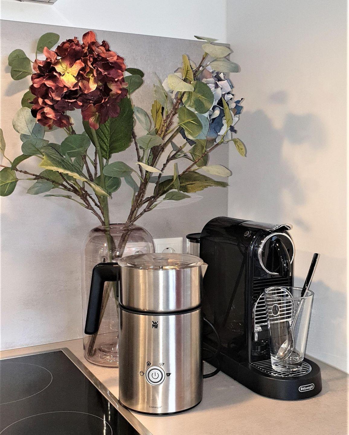 - Vollausgestattete Küche: Kühlschrank mit Gefrierfach, Backofen, Spülmaschine, Geschirr/Besteck, Kochutensilien, Toaster, Mikrowelle, Wasserkocher, Kaffeemaschine mit Filter, Nespresso-Kapselmaschine, elektr. Milchaufschäumer, elektr. Handmixer, Messerblock, Kindergeschirr und Kinderbesteck ( je 2x)