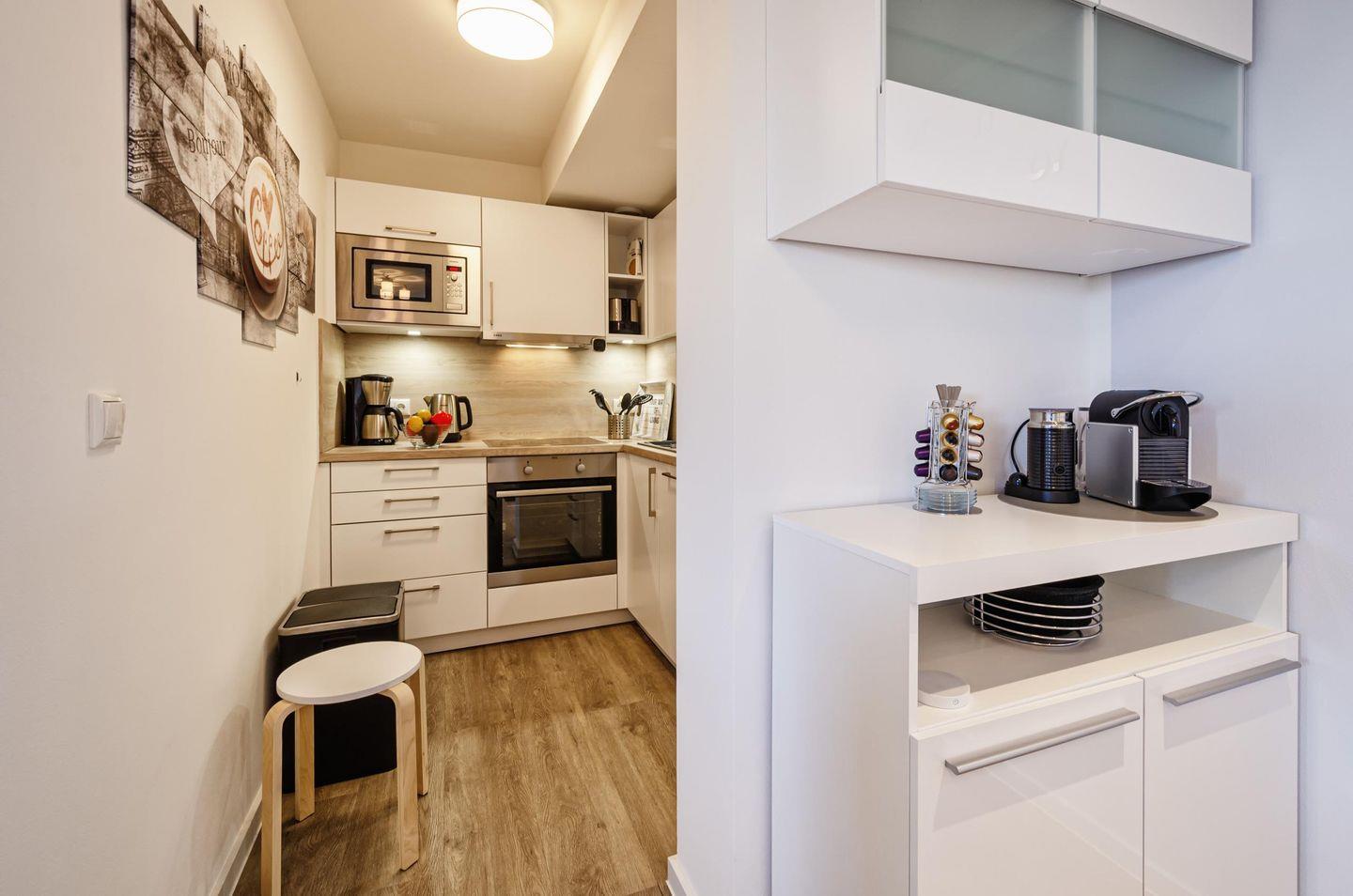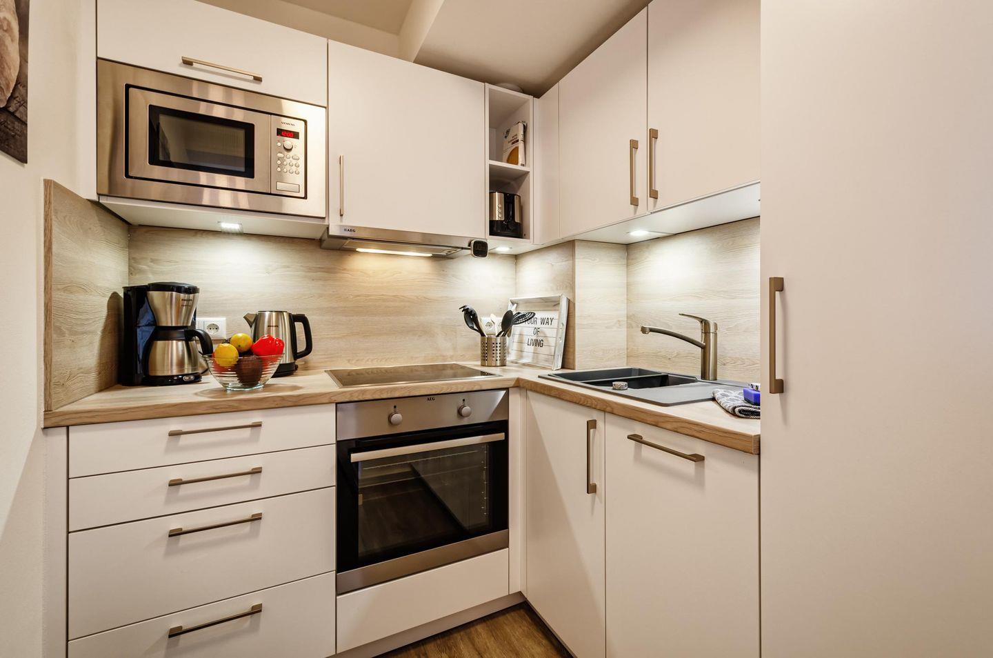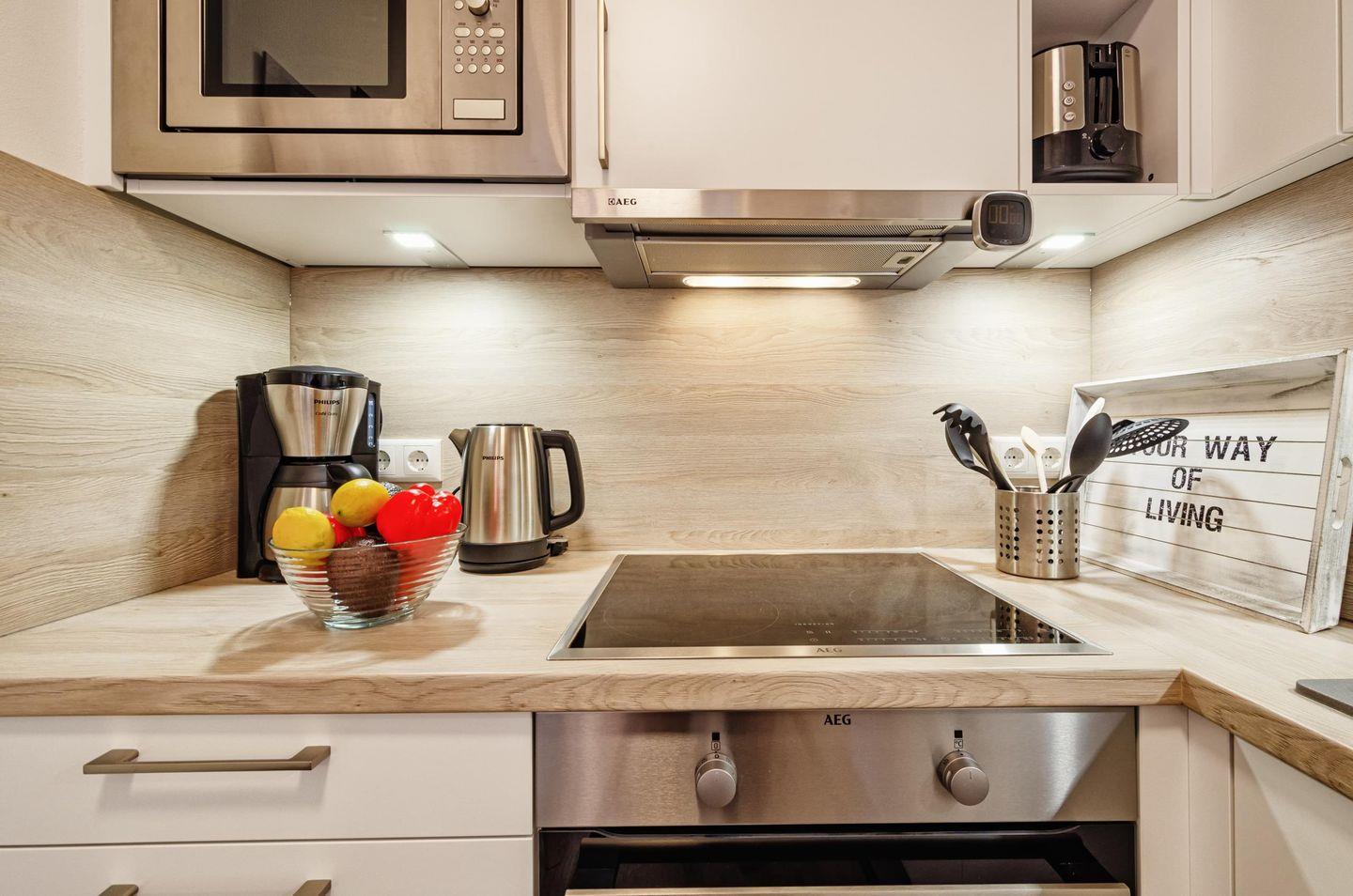 Große bodentiefe Fenster sorgen für viel Licht und ein offenes Raumgefühl. Modernes Design in frischen Farben verbreiten Luxus-Flair. Dieses Apartment ist ein großzügiger offener Raum, der sich unterteilt in Wohn-/Essbereich und separater Küche. Die Küche verfügt über ein Induktionskochfeld, Backofen, Geschirrspülmaschine, eingebaute Mikrowelle sowie einen großzügigen Kühlschrank mit Gefrierfach.
