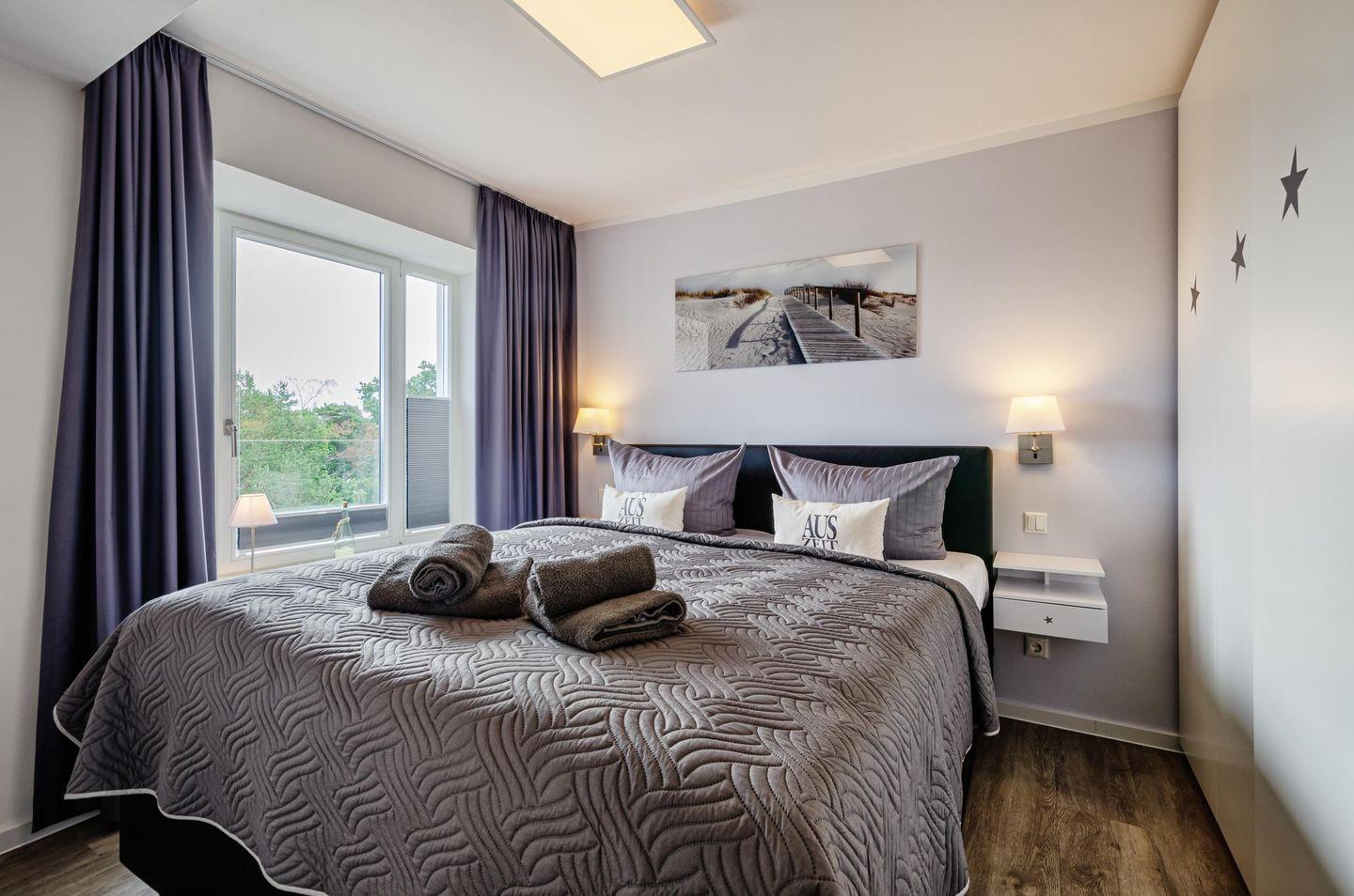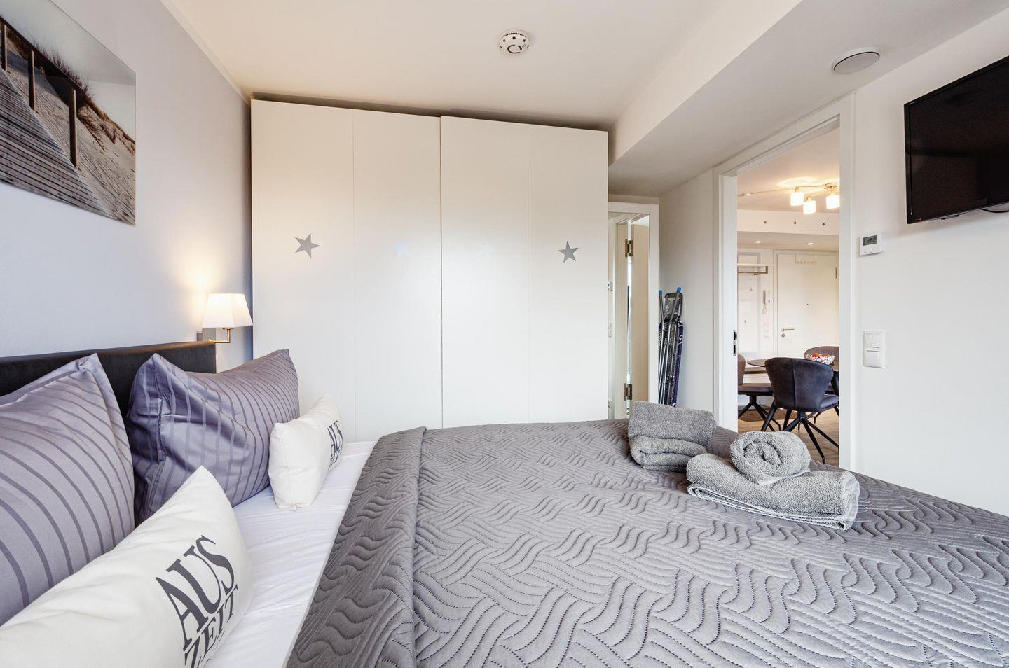 Alle Zimmer sind zum Meer ausgerichtet. Das Apartment besitzt zwei Schlafzimmer, wovon eines mit einem Boxspring-Doppelbett (180x200cm) und eines mit einem Etagenbett (Liegeflächen unten 140x200cm und oben 90x200cm) ausgestattet ist. Damit eignet sich das Apartment auch hervorragend für Familien. Die Kinder werden sich besonders über den feinsandigen Strand freuen, der zum Buddeln und Sandburgen bauen einlädt. In der Wohnung stehen ein paar Spiele sowie eine Xbox-OneX-Konsole (inkl. 2 Controller) und ein Netflix-Account zur Nutzung bereit.