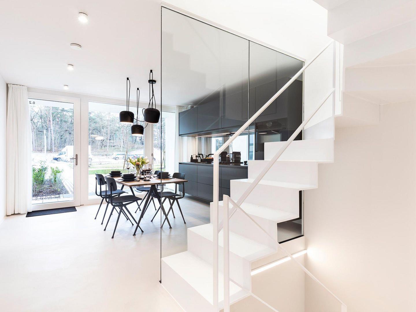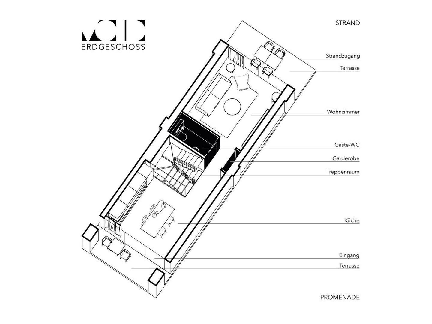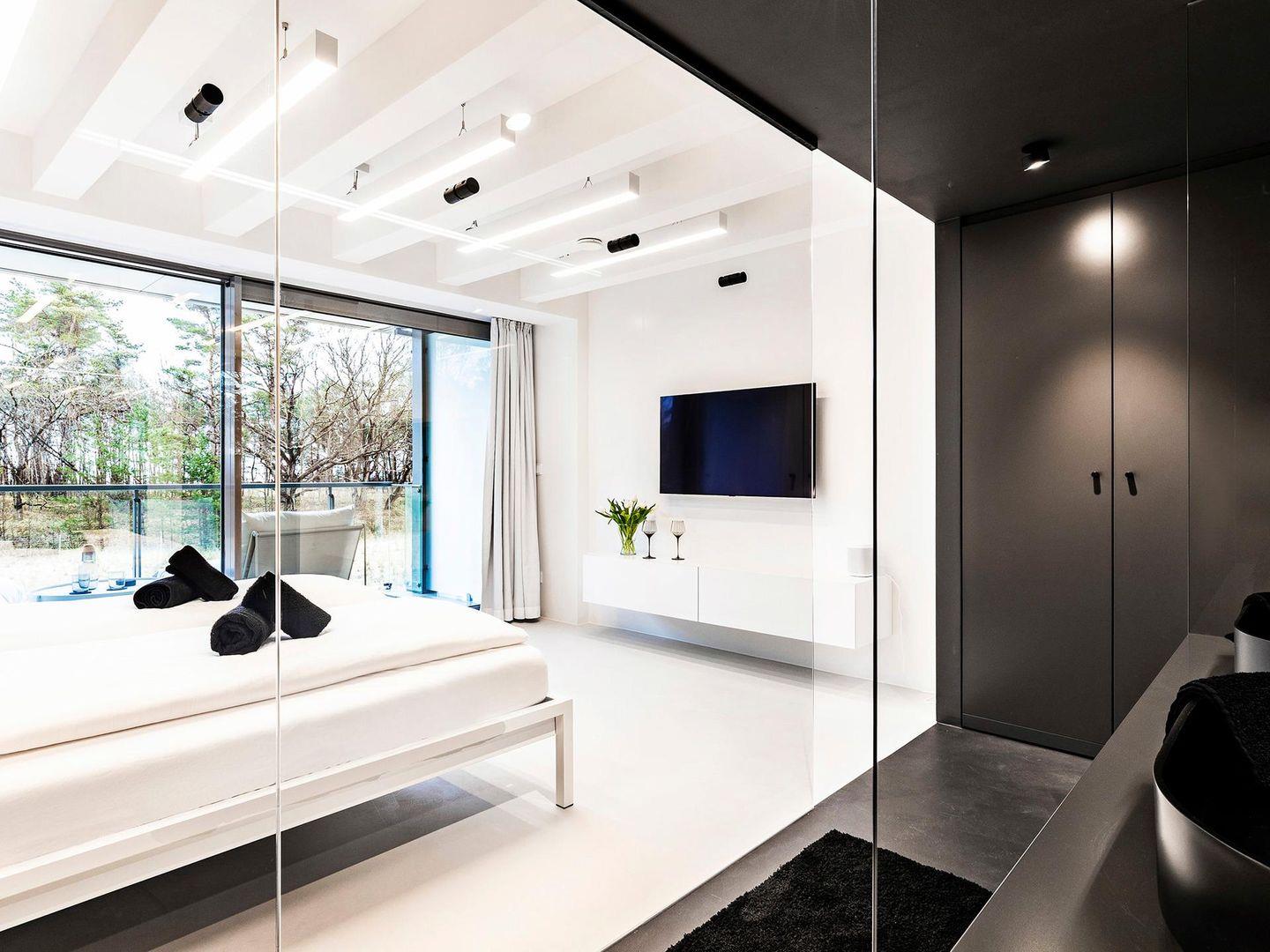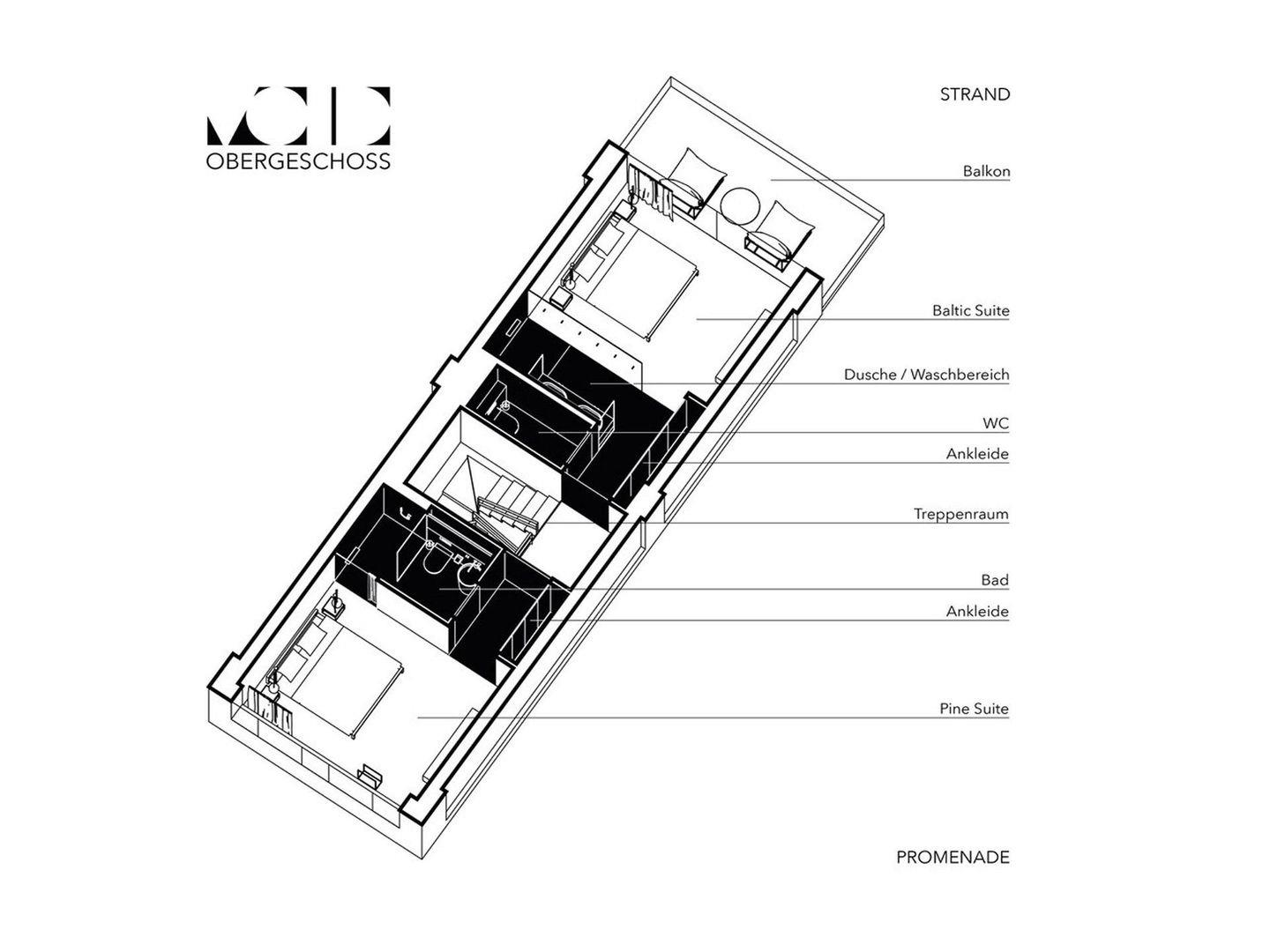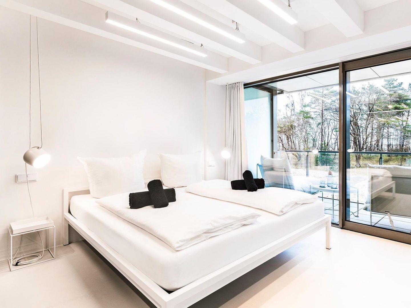 Willkommen im VOID Konzeptapartment. Erlebt minimalistisches Design auf drei Etagen. Ihr betretet das Apartment über eine kleine Terrasse direkt von der Promenade. Der Eingang führt in den modernen Küchen und Essbereich. Der Raum besticht durch seine helle Atmosphäre und die wandhängende Küche. Das dunkle Gäste-WC steht im Kontrast zum hellen Wohnbereich. Das puristische Design des Wohnzimmers und die großen Schiebefester inszenieren den Ausblick in die Dünenlandschaft. Von der Wohnzimmerterrasse gelangt Ihr mit wenigen Schritten zum weißen Strand der Binzer Bucht. Die filigrane Faltwerktreppe verbindet die drei Etagen des VOID?s. Im Obergeschoss befinden sich zwei Suiten. Das White-on-White Design der Schlafräume steht im Kontrast zu den dunklen Ankleiden und Bädern. Einbauschränke bieten genug Stauraum für Eure Kleidung. In der Baltic-Suite genießt Ihr den Ausblick vom privaten Balkon auf die Ostsee. Im Untergeschoss des VOID?s befindet sich der Spa Bereich. Die einzigartige Atmosphäre der dunklen und rauen Wände und Decken lädt zum entspannen ein. Euch stehen eine großzügige Sauna, eine Dusche und ein Ruhebereich zur Verfügung. Minimalismus bedeutet auf unnötiges Beiwerk zu verzichten um Raum für die wichtigen Dinge zu schaffen. Das VOID bietet Euch ein Gleichgewicht aus Voll und Leer ohne Kompromisse bei Komfort und Raumwirkung.