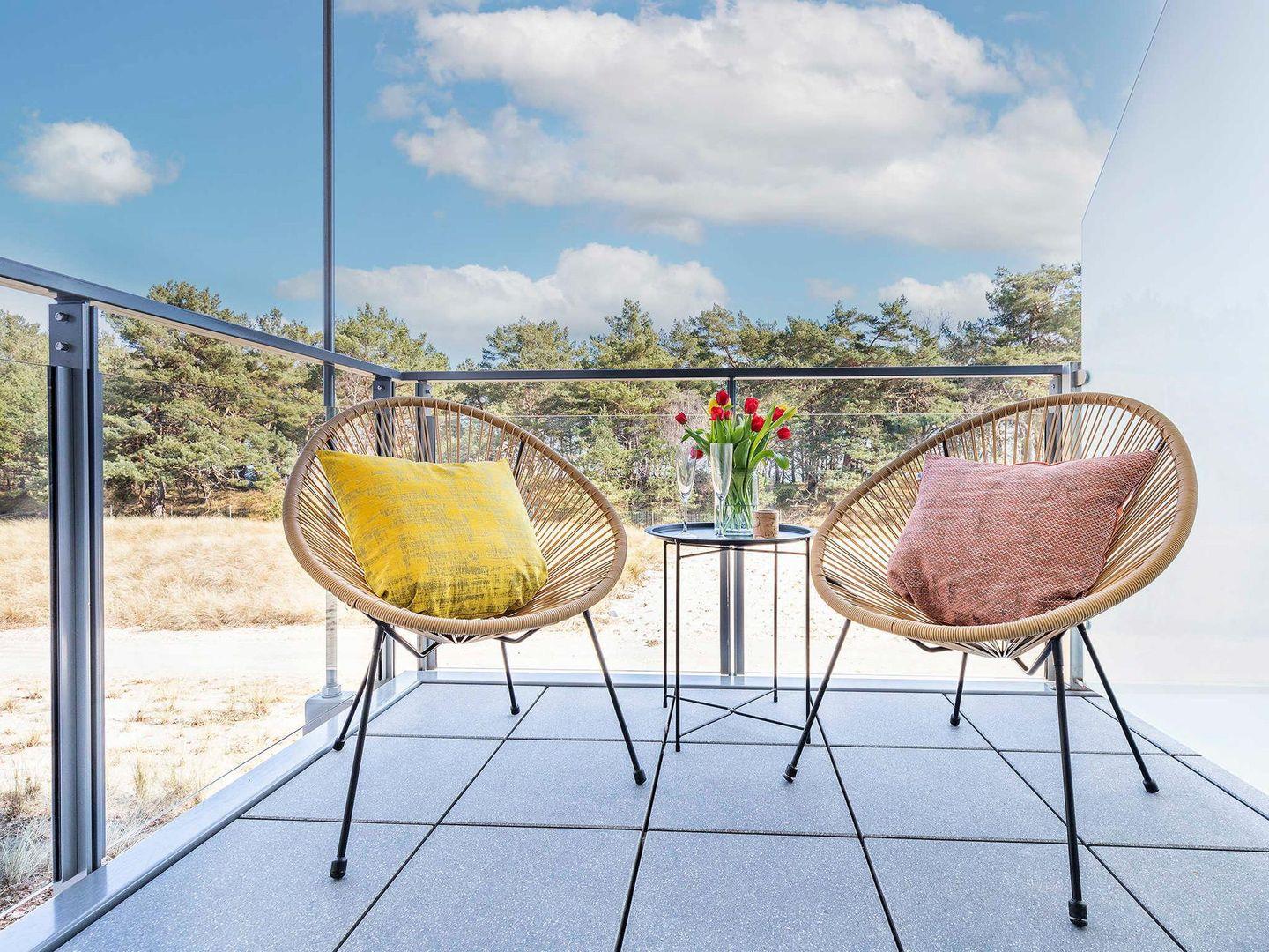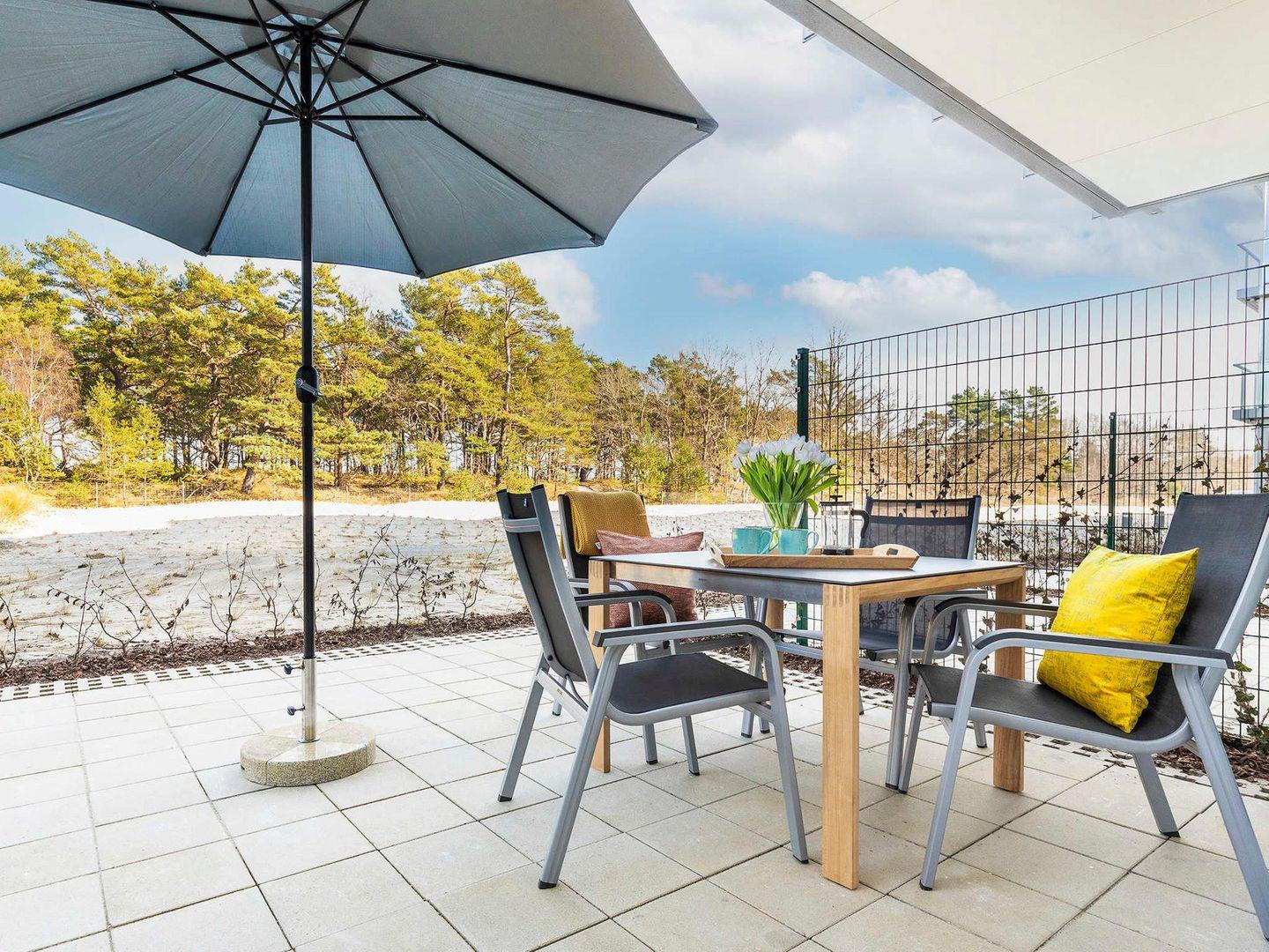 - Terrasse mit Tisch und 4 Stühlen, Blick auf die Dünenlandschaft