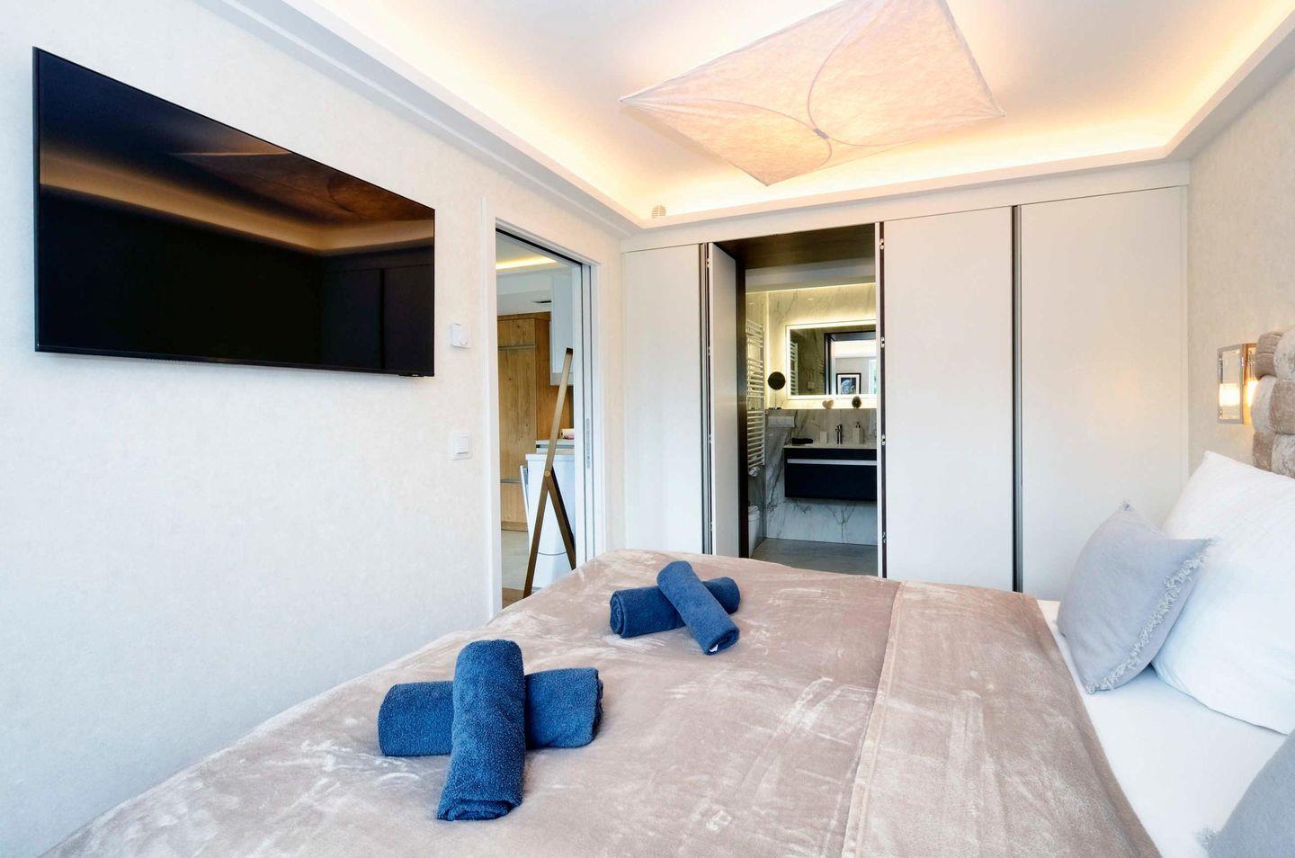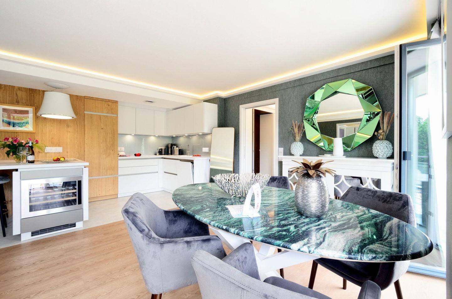 Die voll ausgestattete Küche ist besonders hochwertig und verfügt unter anderem über einen Weinkühlschrank. Hier können Sie gemeinsam kochen und die Mahlzeiten genießen. In der Wohnung stehen drei Fernseher zur Verfügung. Alle drei Geräte sind Netflix-tauglich. Somit können Sie Ihre eigenen Netflix-Inhalte auch im Urlaub genießen.