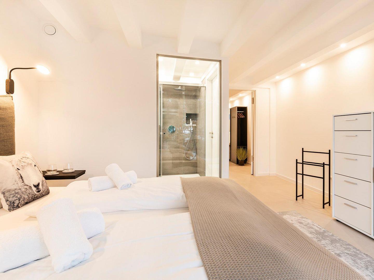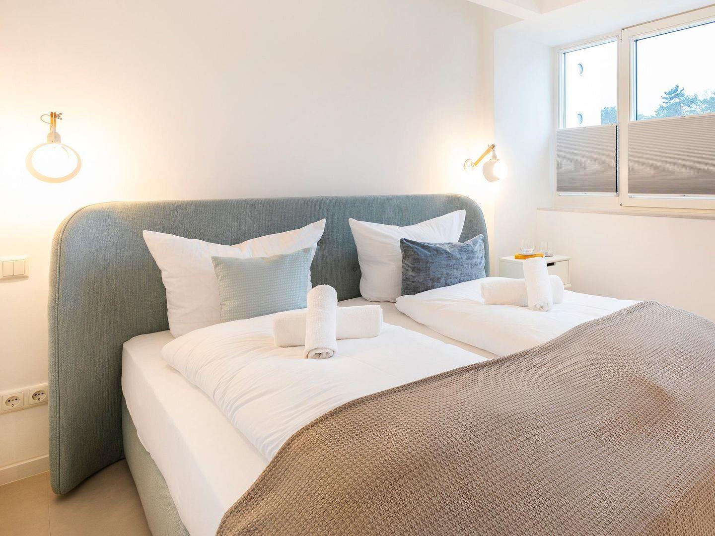 - Schlafzimmer 1: Doppelbett (180x200), Schrank, Smart-TV, Verdunkelungsmöglichkeiten, Zugang zum Balkon (Seeseite)
