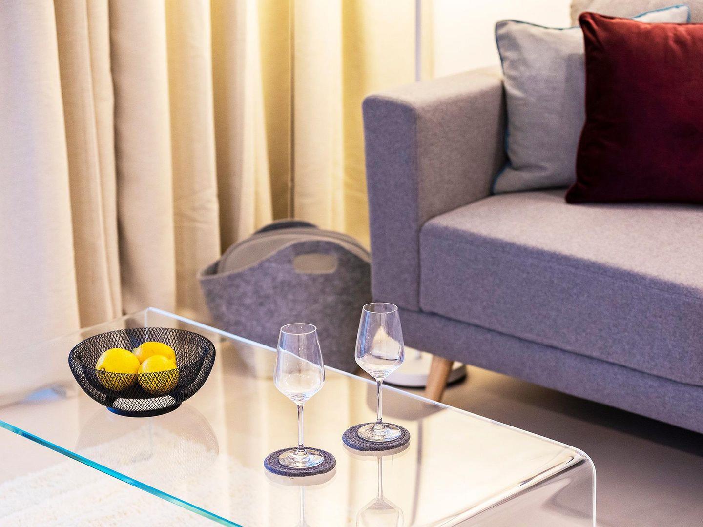 - Wohn-/Essbereich: Schlafcouch (90 x 180), Sitzbereich, Essbereich, Smart-TV, mobiles Soundsystem (via Bluetooth), Zugang zum Balkon
