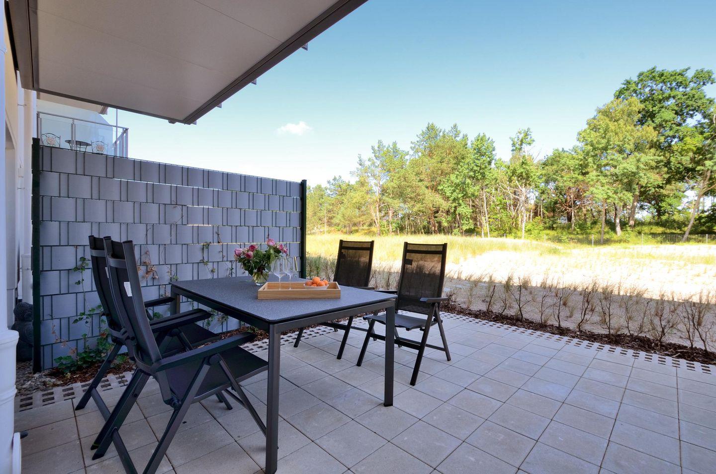 - Terrasse mit Tisch und 4 Stühle, Blick auf Dünenlandschaft