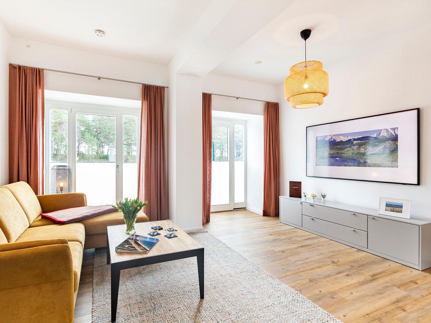 Exklusive 91 m² Dünen-Ferienwohnung in Prora mit Balkon, Terrasse, Sauna und direktem Strandzugang.