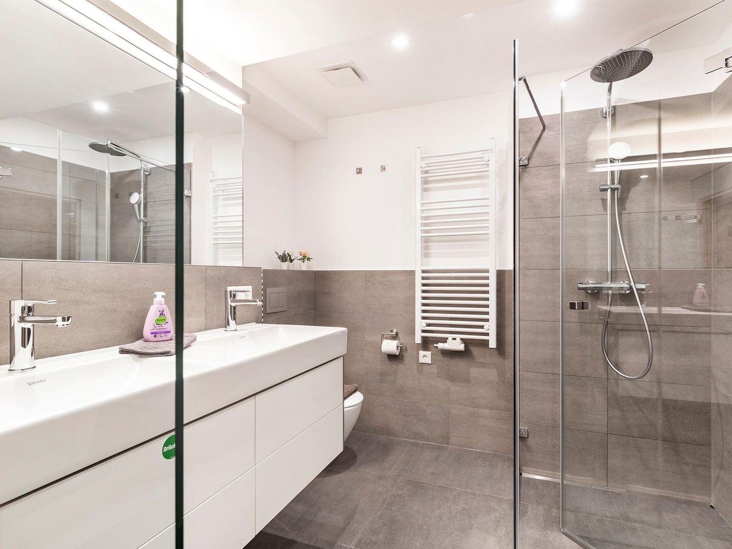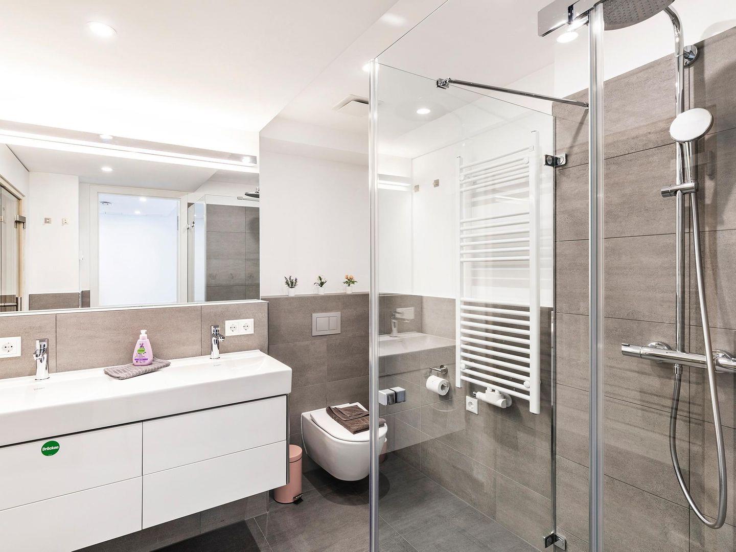- Badezimmer: Regendusche, WC, Waschbecken, Haartrockner