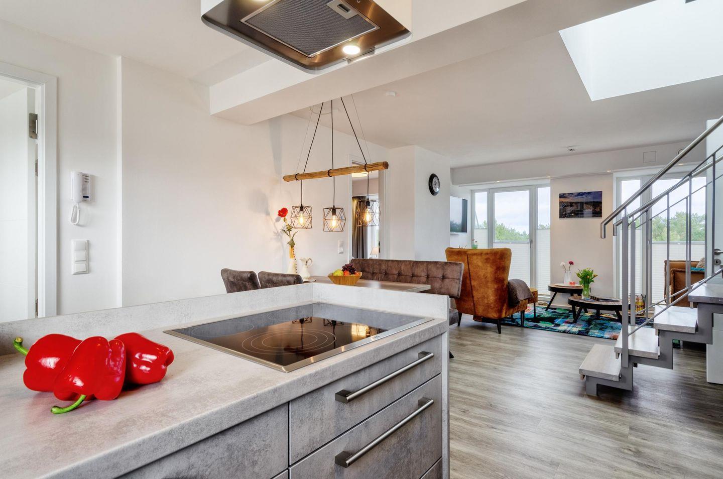 Komfortables Penthouse-Apartment in Prora mit Meerblick, Balkon, Dachterrasse und Sky-Sauna nur 50 m vom Strand entfernt.
