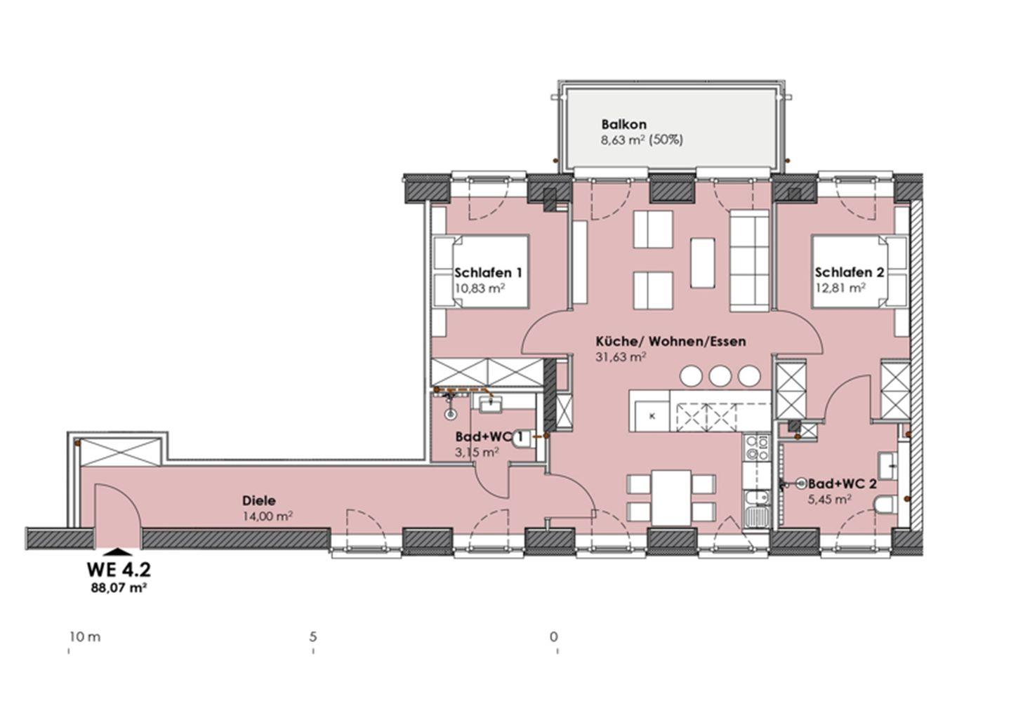 - Wohn/Essbereich: Sofa, Sitzbereich, Essbereich, Flach-TV, Balkonzugang