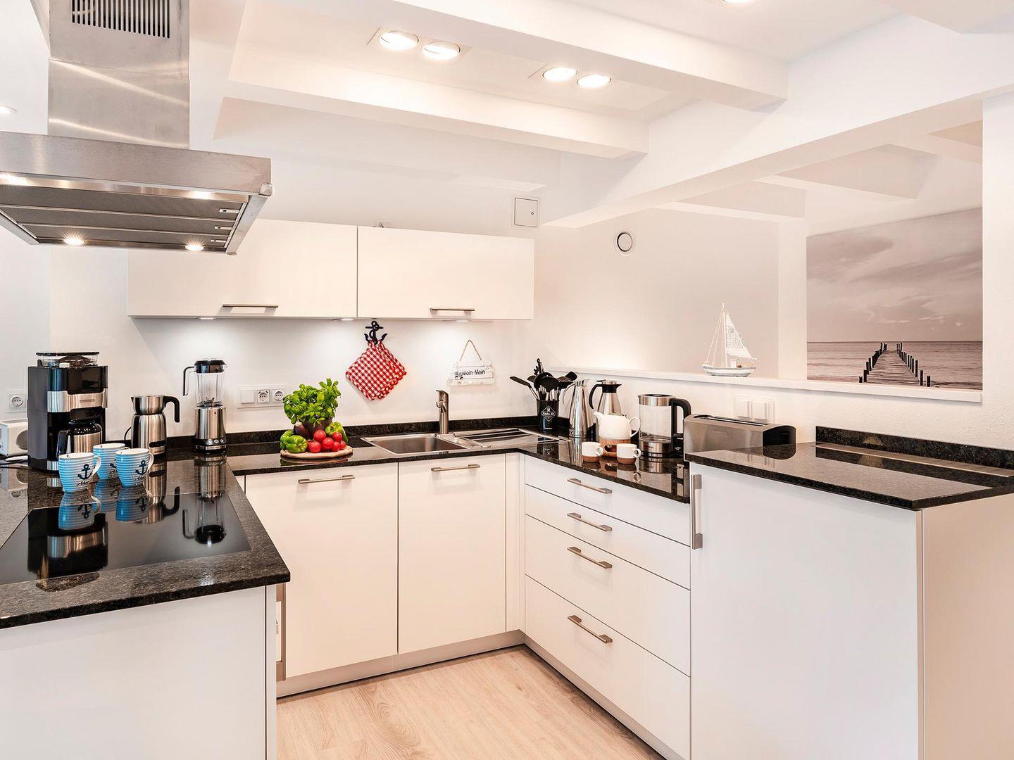 Im dritten Stockwerk der Ferienwohnung befindet sich ein offener Wohn- und Kochbereich. Hier können Sie gemütliche Stunden verbringen und gemeinsam kochen und essen. Das TV-Gerät ist netflixfähig und ermöglicht es Ihnen, Ihre eigenen Netflix-Inhalte anzuschauen. Die Küche ist voll ausgestattet und verfügt über eine Kaffeemaschine mit Filter. Vom Balkon aus, der mit einem Tisch und vier Stühlen ausgestattet ist, haben Sie einen wunderschönen Blick auf das Meer. Ein Gäste-WC rundet das Angebot ab.