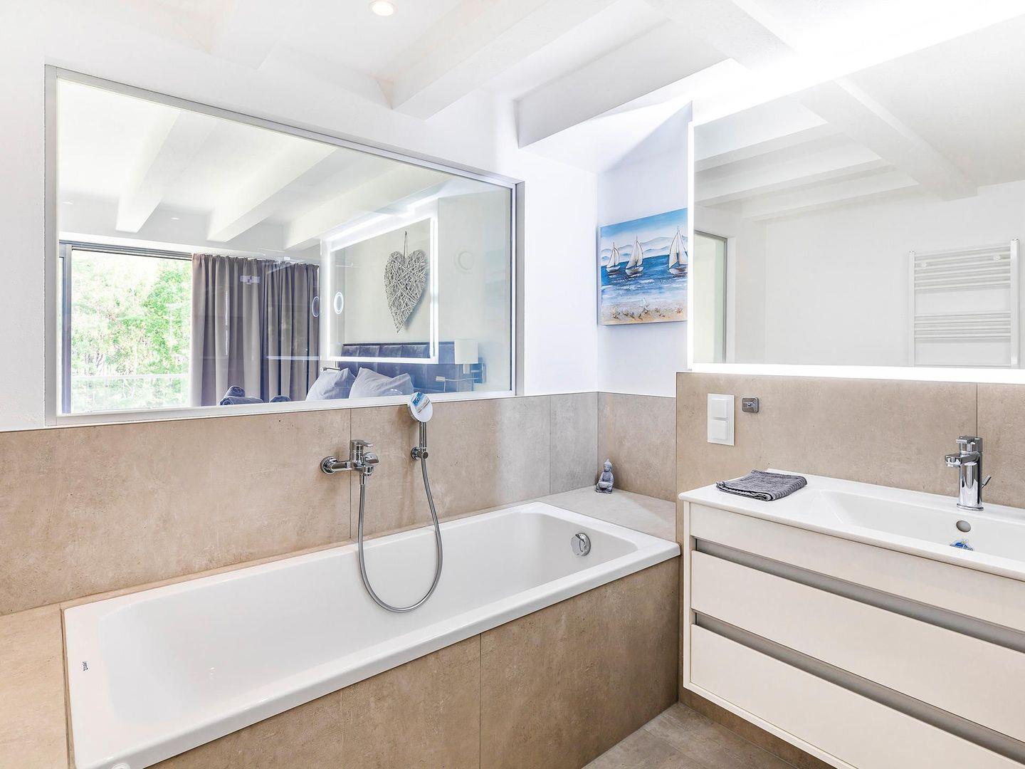 Im zweiten Stockwerk der Ferienwohnung befinden sich zwei Schlafzimmer. Beide Schlafzimmer sind mit einem Doppelbett (180x200) und einem TV ausgestattet. Vom ersten Schlafzimmer aus haben Sie zudem Zugang zum Balkon und einen atemberaubenden Blick auf das Meer. Das Badezimmer verfügt über eine Dusche und eine Badewanne. Ein Internetanschluss (WLAN) ist in der Ferienwohnung inklusive. Die Wohnung ist zudem mit einer Fußbodenheizung ausgestattet, die für eine angenehme Wärme sorgt. Ein direkter Strandzugang ermöglicht es Ihnen, schnell und bequem ans Meer zu gelangen.