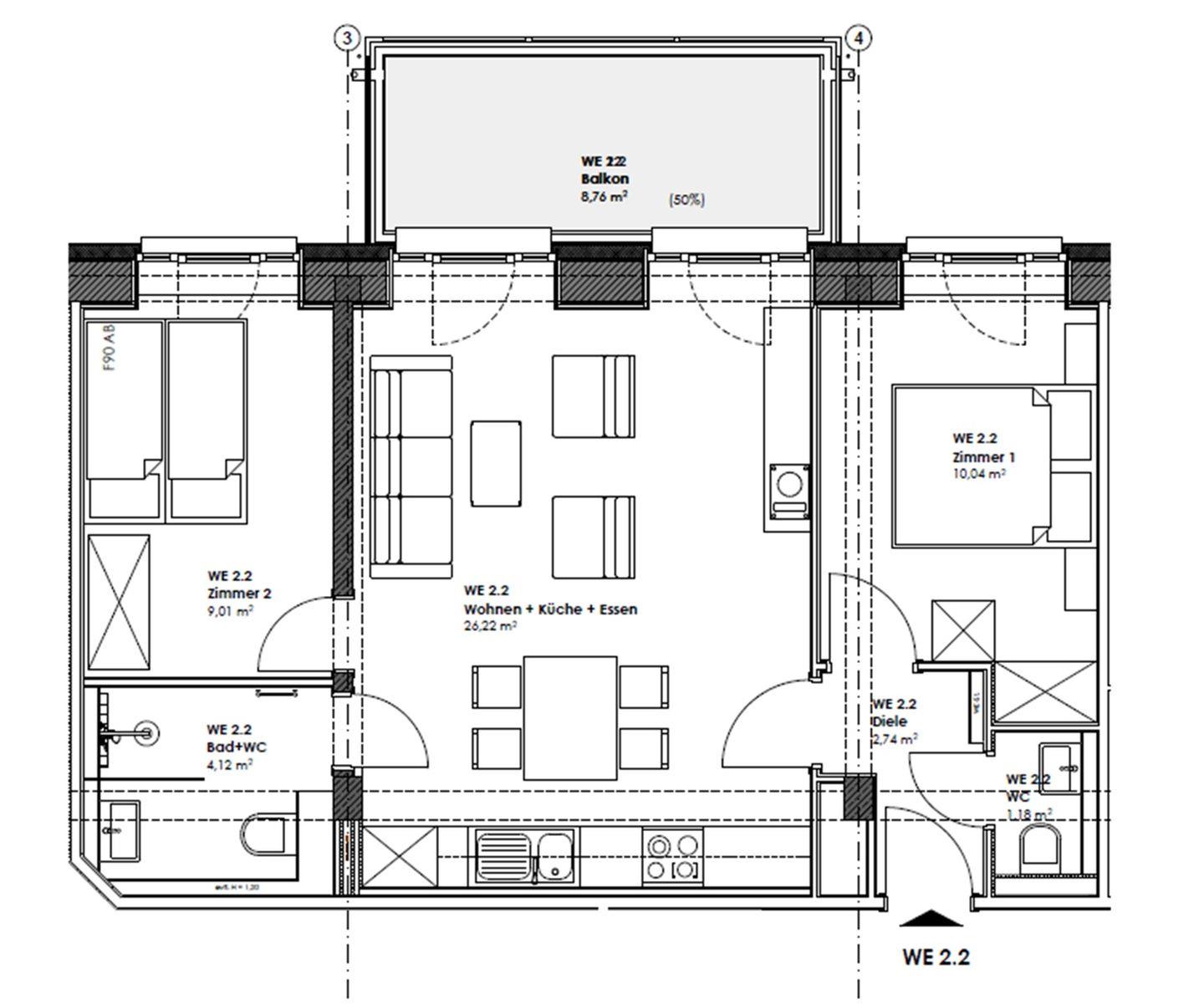 - Wohn/Essbereich: Sofa, Sessel, TV, Zugang zum Balkon