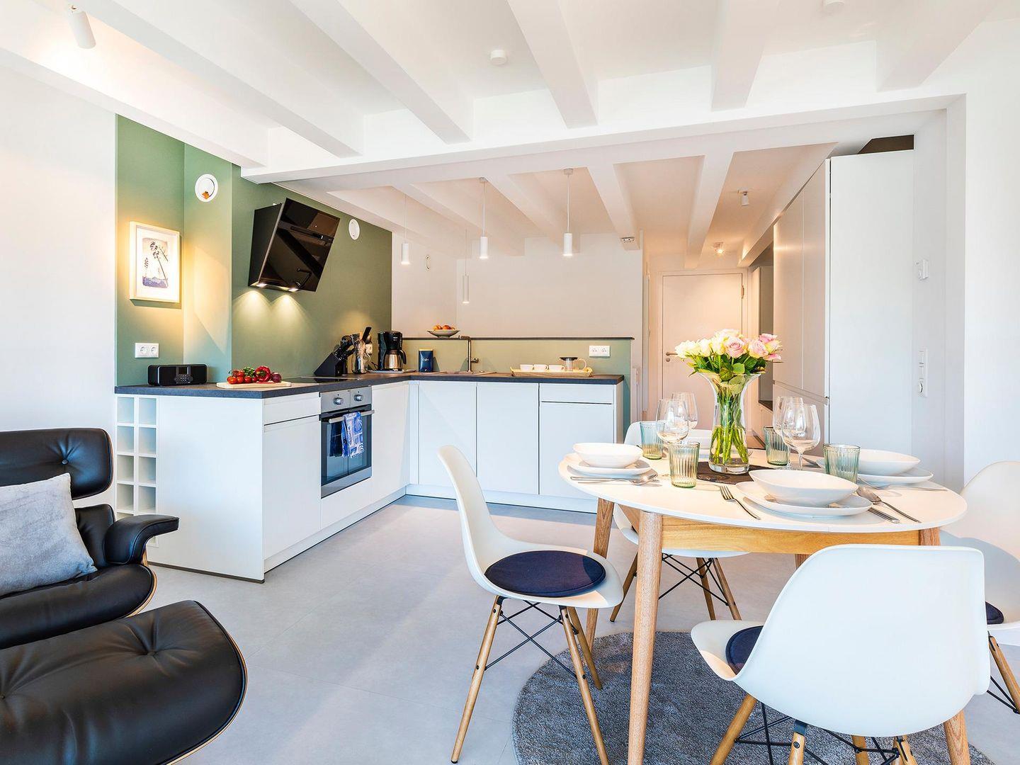Der Eingang in der dritten Etage führt zu einem großzügigen offenen Wohn- und Essbereich mit einer voll ausgestatteten Einbauküche und zum ersten Duschbad, welches sich durch seine Lage im Eingangsbereich als sehr praktisch erweist, wenn man gerade vom Sonnenbad am Strand zurückkommt. Der wunderschöne Badestrand, der sich nur einige Meter entfernt vor der Ferienwohnung ausbreitet, zählt mit seinem feinen, weißen Sand und dem kristallklaren, blaugrünen Meer zu einem der schönsten Deutschlands und ist über den hauseigenen Zugang, über einen kurzen Weg durch ein Kiefernwäldchen, in wenigen Minuten zu erreichen. Nur Dünen, Strandhafer und Küstenwald liegen zwischen der Unterkunft und dem Meer, die Sicht bleibt ungetrübt von Asphalt und Fahrzeugen.