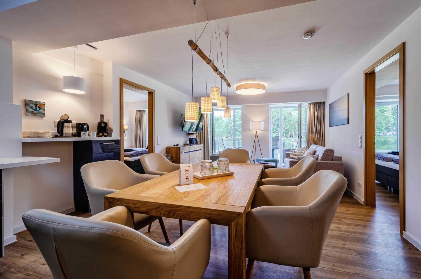 Mit dem Fahrstuhl erreichen Sie barrierefrei die Ferienwohnung "Moin" in der ersten Etage. Auf dem Balkon können Sie über die Dünen durch die Kiefern und Birken das Meer erblicken. Beide Schlafzimmer sind zur Ostsee ausgerichtet – hier werden Sie am Morgen mit Sonnenstrahlen begrüßt und am Abend lassen Sie die Wellen sanft zur Ruhe kommen. Ausgestattet mit zwei Doppelbetten und einem Sofa im Wohnzimmer, welches sich ausziehen lässt, finden bis zu sechs Personen hier eine entspannte Atmosphäre. Zwei Badezimmer mit jeweils einer Dusche und einem WC laden Sie mit ausreichend Platz zur Pflege nach einer langen Dünenwanderung oder nach dem Baden in der Ostsee ein. In dem En Suite Bad finden Sie ausreichend Platz an dem Doppelwaschbecken, um sich die morgendliche Erfrischung und die abendliche Pflege zukommen zu lassen. Im zweiten Schlafzimmer haben wir für Ihren Aufenthalt/Homeoffice einen Schreibtisch aufgestellt.