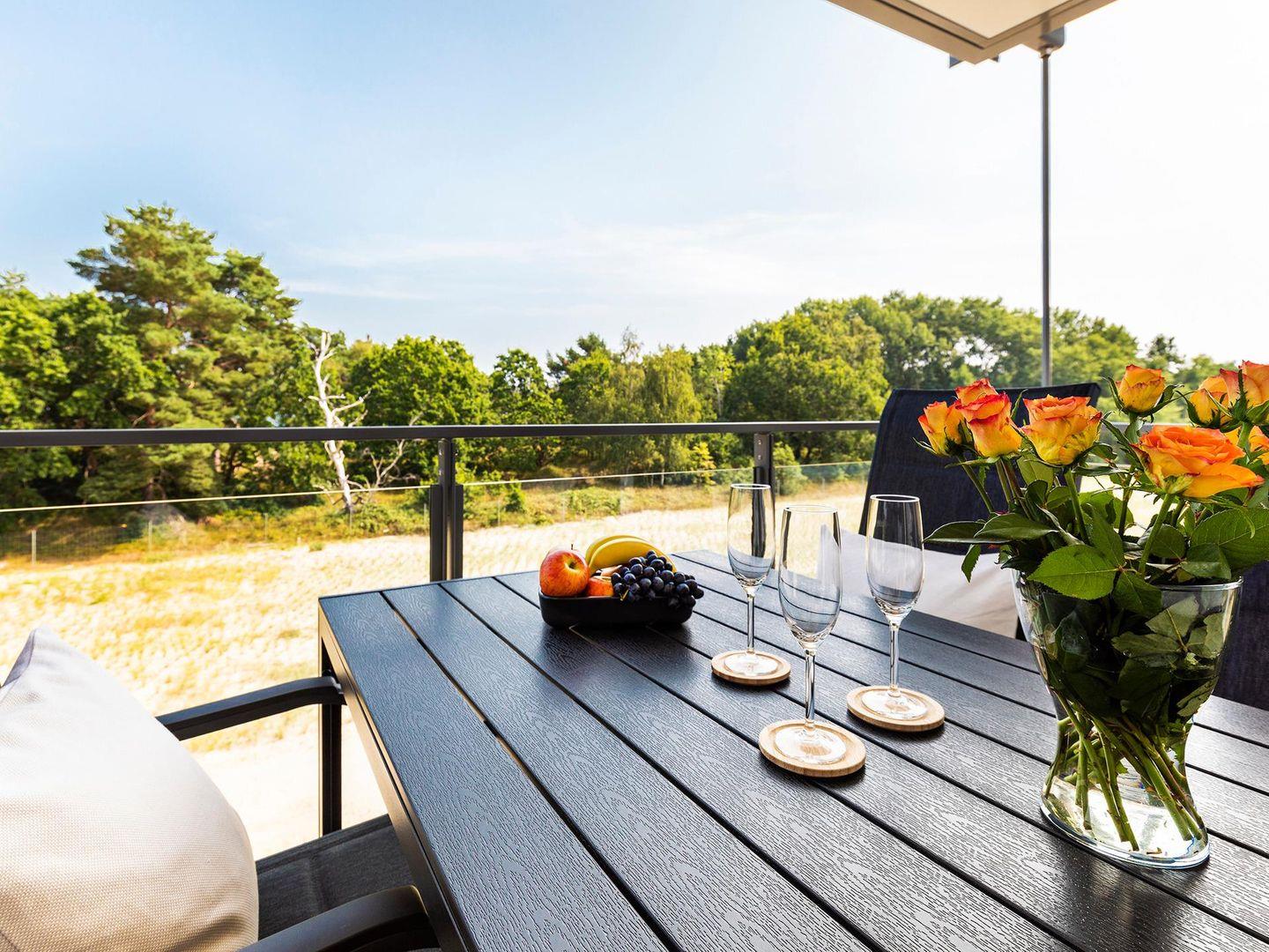 Familienfreundliche Ferienwohnung in Prora, 50 m vom Meer, mit 2 Schlafzimmern, 2 Bädern und Balkon mit Dünenblick.