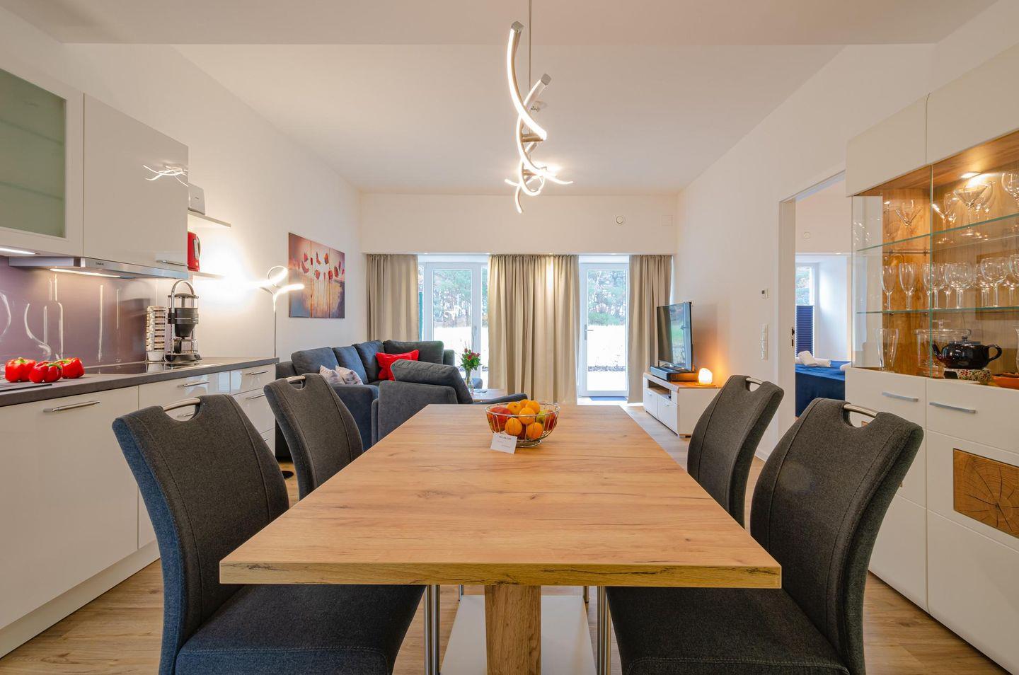Im Haus Arkona erwartet Sie eine liebevoll eingerichtete Ferienwohnung, nur 100 m vom Meer entfernt. Ein Schlafzimmer mit Doppelbett und ein Zimmer mit Etagenbett bieten Platz für kleine und große Gäste. Der Wohnbereich führt auf eine Terrasse mit Blick auf die Dünen. Fußbodenheizung, WLAN und eine moderne Küche sorgen für Komfort. Zur Wohnung gehören eine Waschmaschine, ein Parkplatz mit E-Ladestation sowie die Sky-Sauna mit Dachterrasse und Ostseeblick.