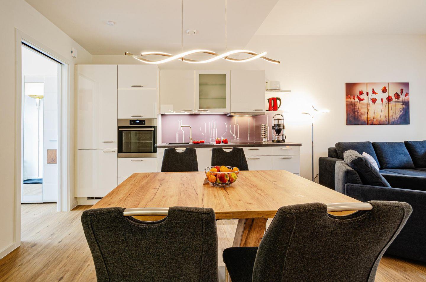 Diese Ferienwohnung besteht aus einem großzügigen Raum mit einem Wohn- und Essbereich und einer offenen Küche, zwei separaten Schlafzimmern und einem Bad. Im Wohnzimmer finden Sie eine Auswahl an Gesellschaftsspielen, eine bunte Mischung an Büchern sowie einen DVD-Player und DVDs - perfekt für verregnete Tage oder entspannte Abende.
