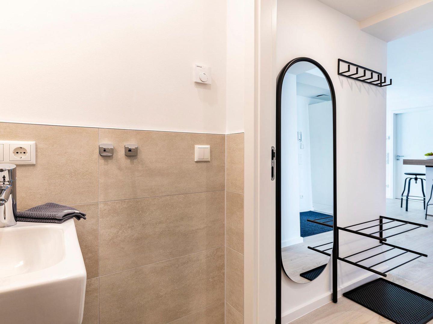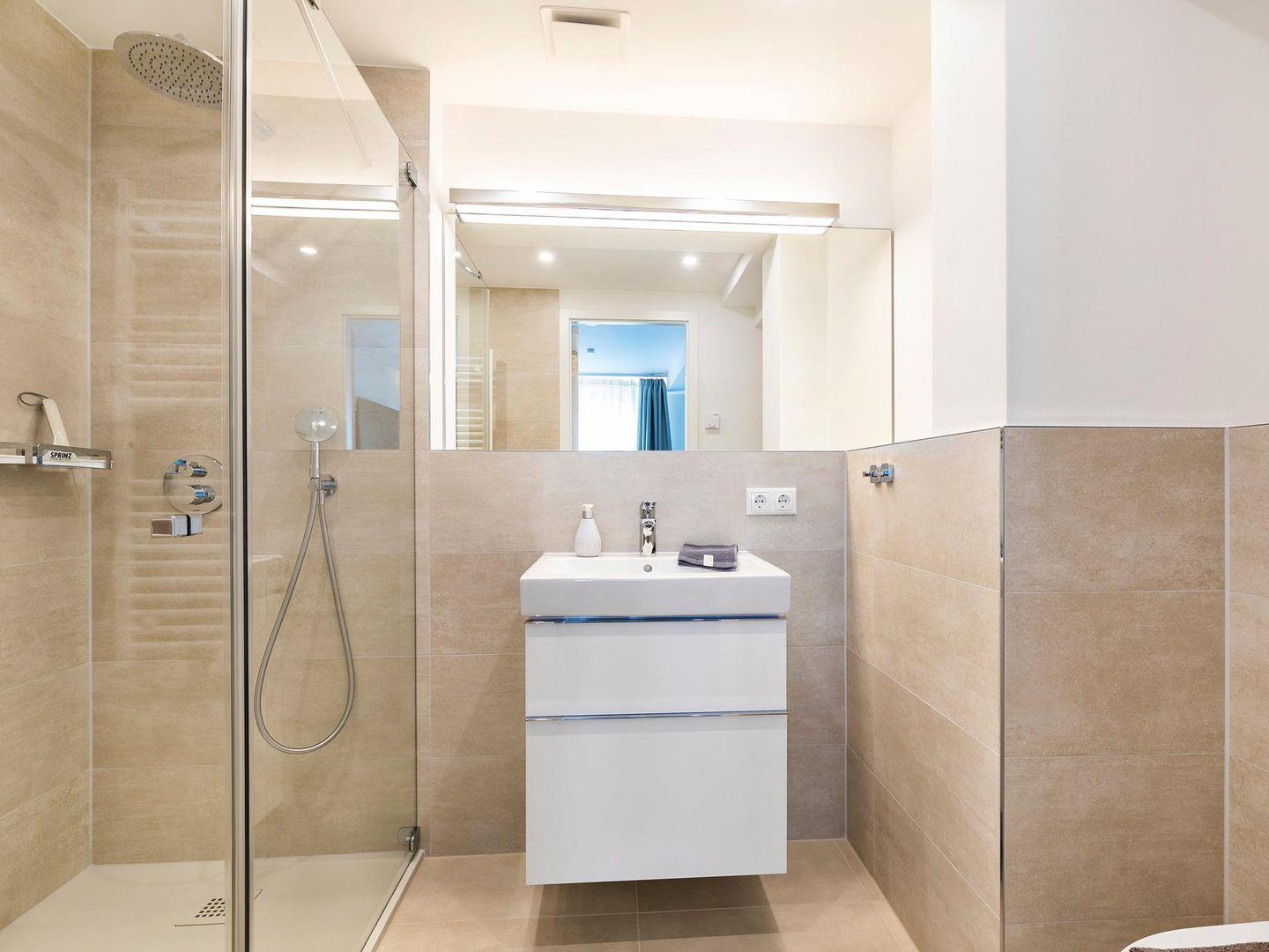 - Badezimmer: Regendusche, WC, Haartrockner