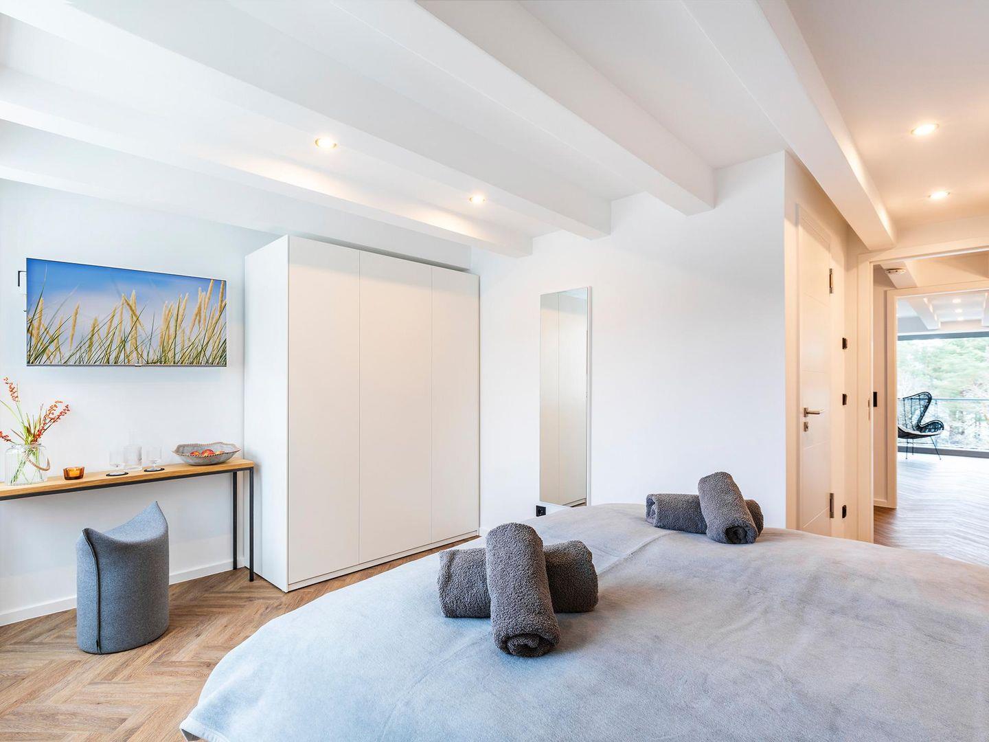 - Schlafzimmer 1: Doppelbett (180x200), Kleiderschrank, Smart-TV, Zugang zum Balkon mit 2 Sonnenliegen