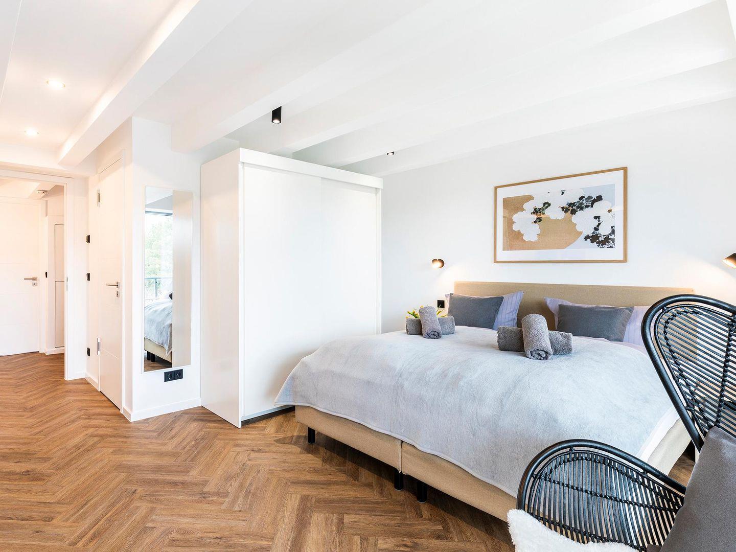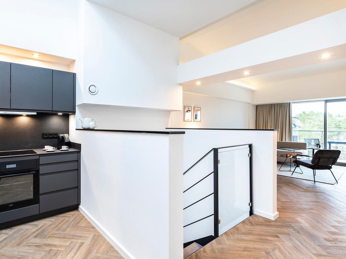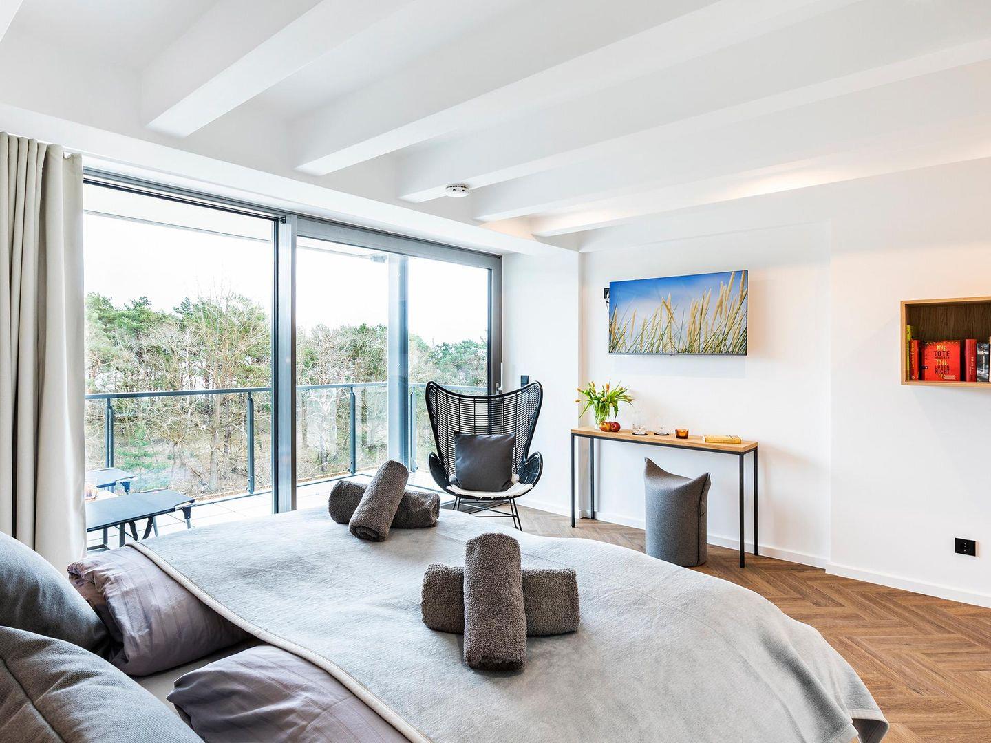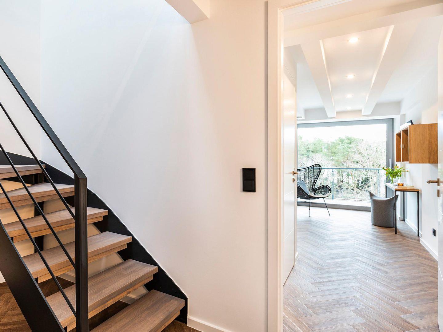 Auf rund 100 m² ganz oben in der 5. und 4. Etage des 2021/22 fertig gestellten Hauses Wittow lässt sich der Sonnenuntergang von zwei großen Balkonen mit Meerblick genießen.