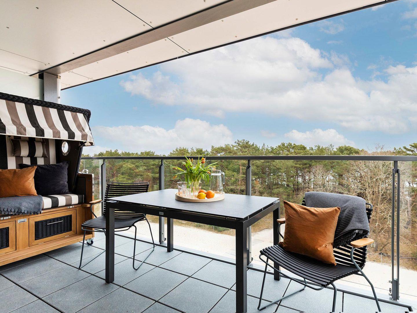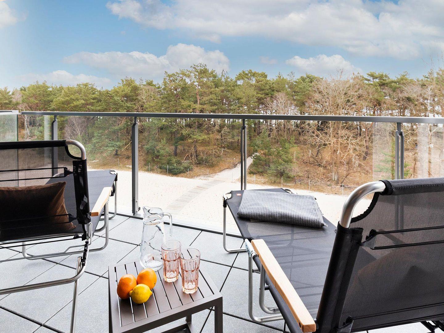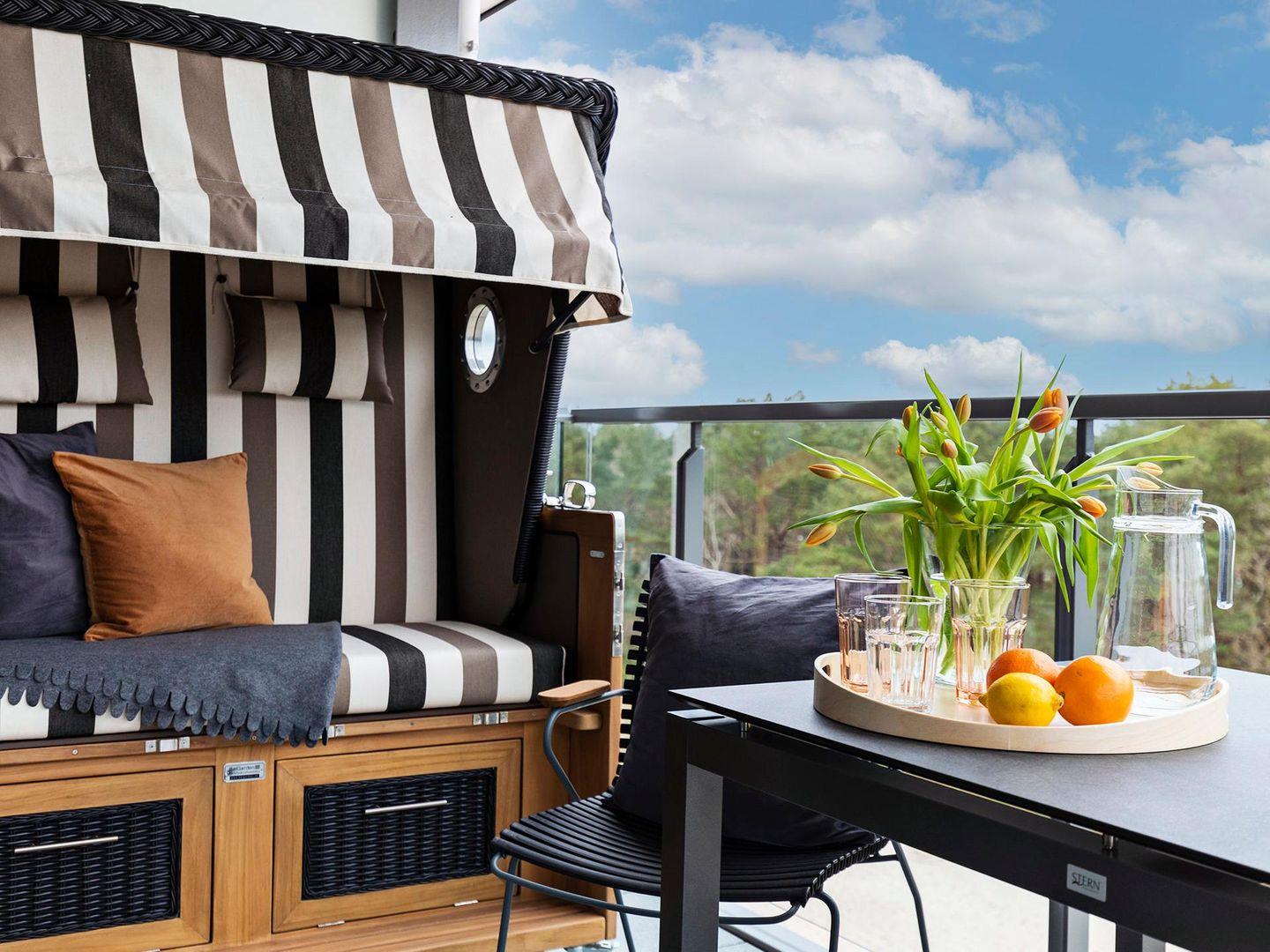 Moderne 100m² Ferienwohnung in Prora mit Meerblick, zwei Balkonen, Strandkorb und direktem Strandzugang.
