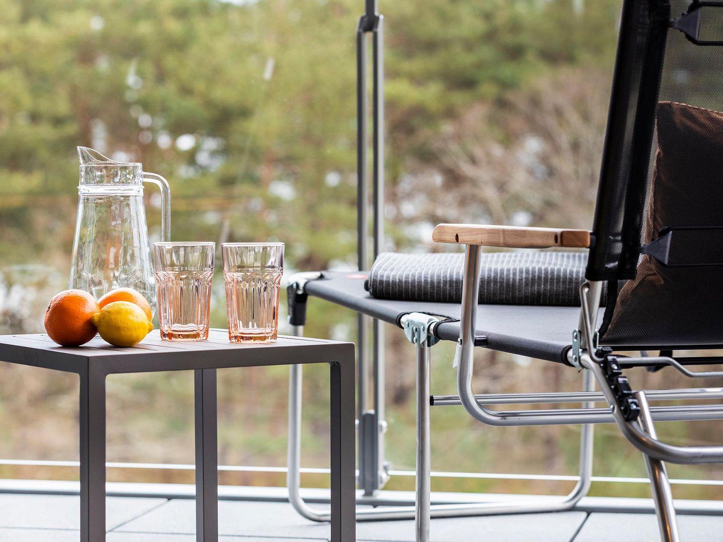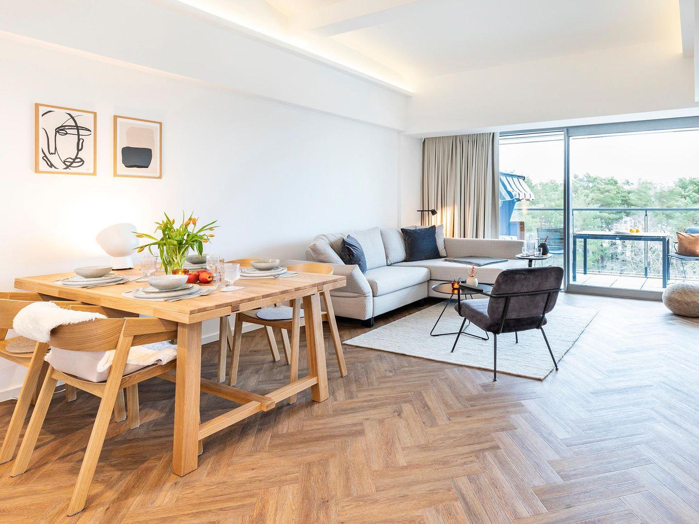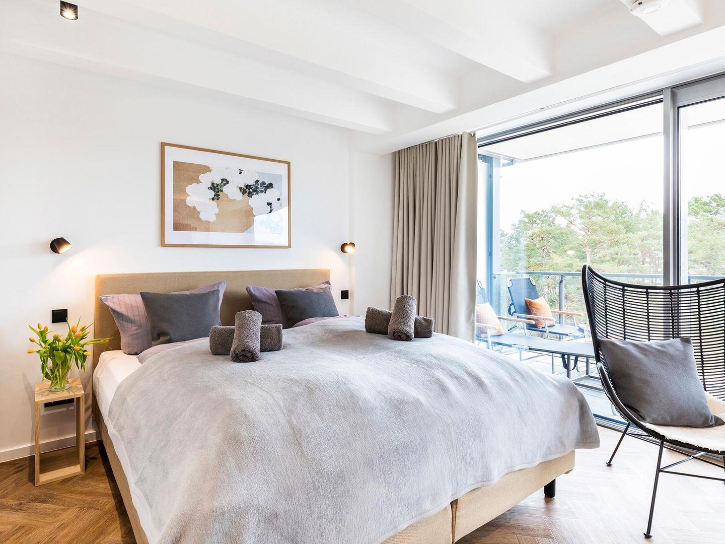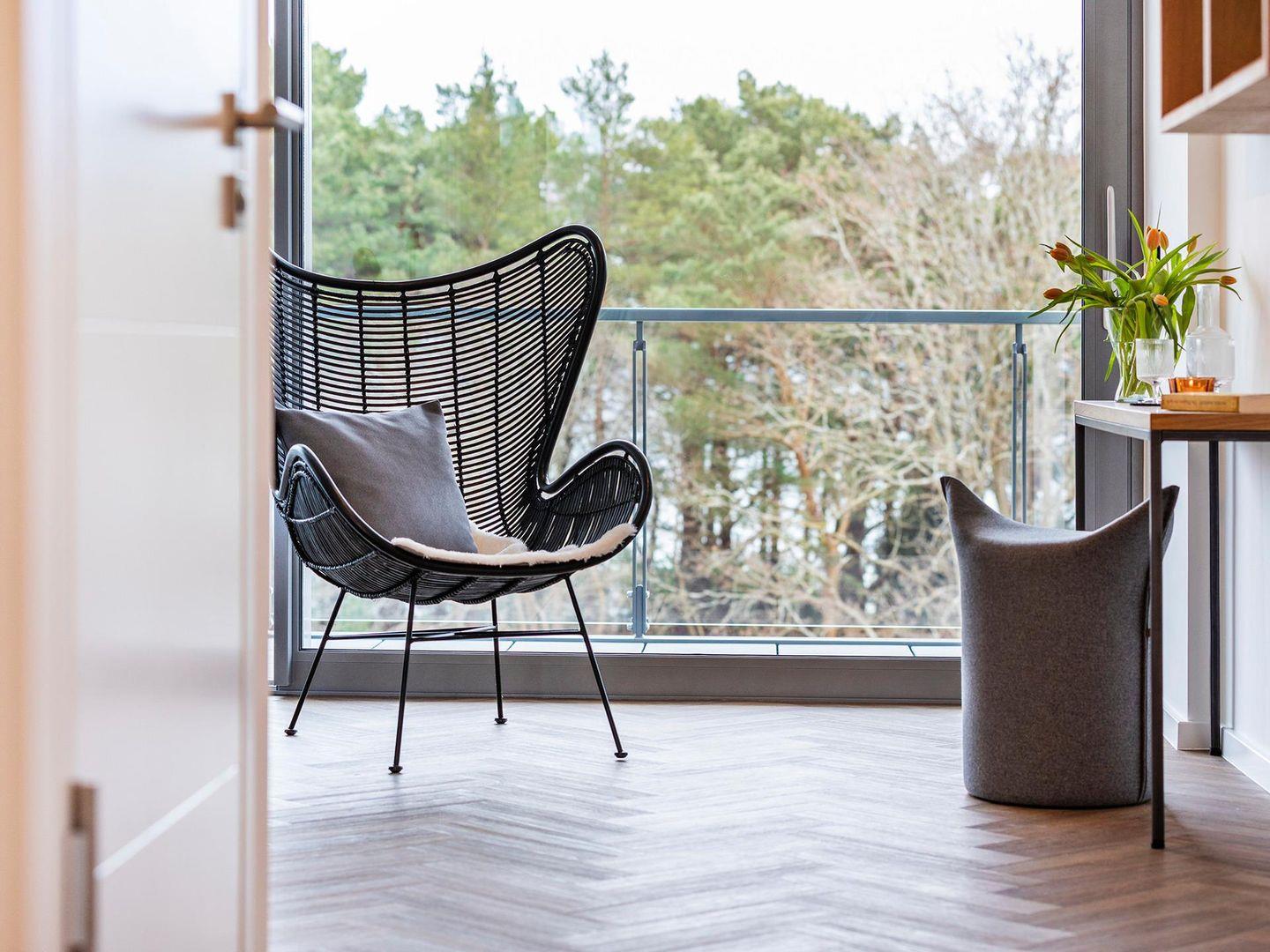 Moderne 100m² Ferienwohnung in Prora mit Meerblick, zwei Balkonen, Strandkorb und direktem Strandzugang.