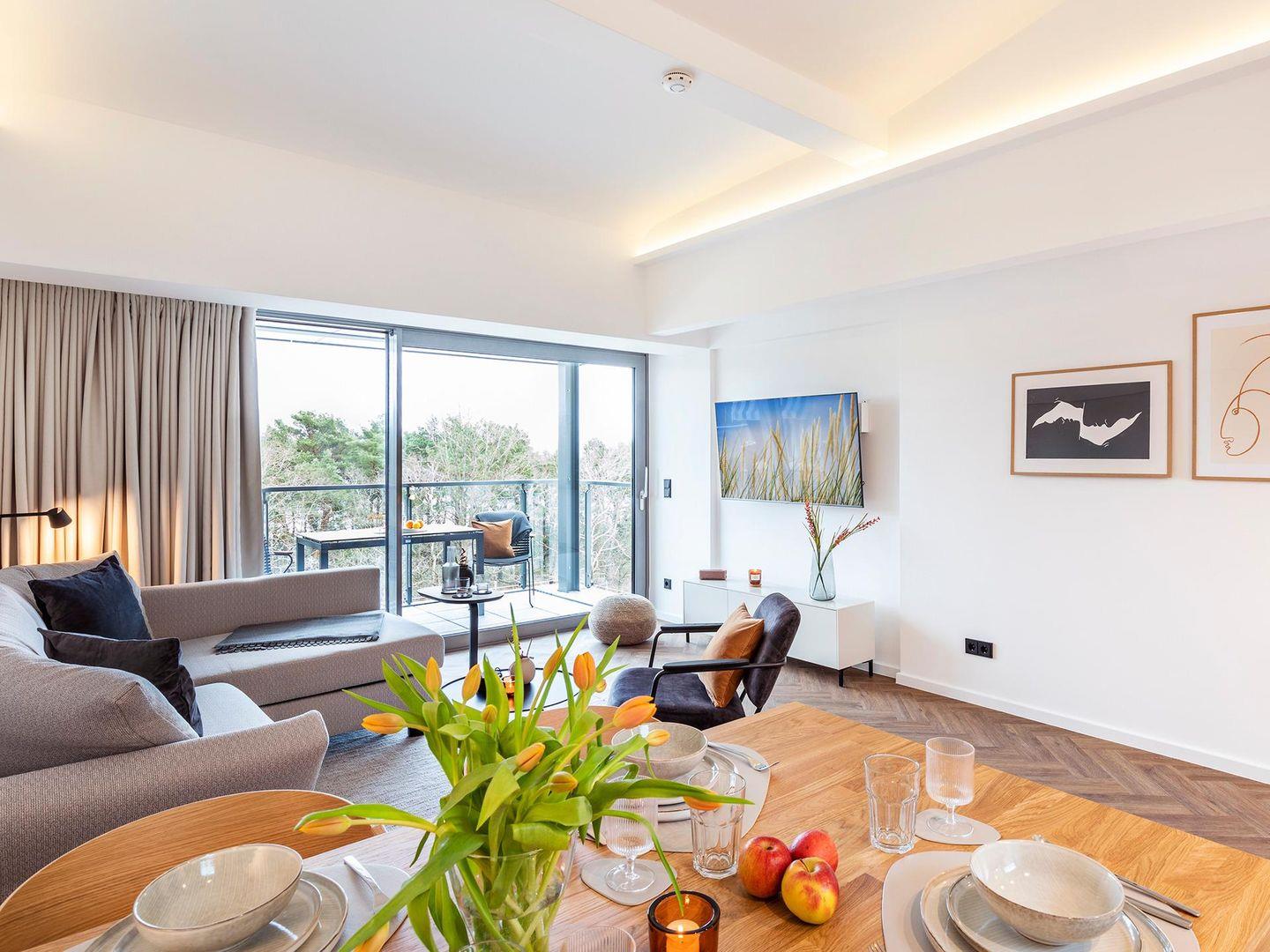- Wohn/Essbereich: Schlafsofa, Smart-TV, Zugang zum Balkon mit Strandkorb, Tisch und Stühlen