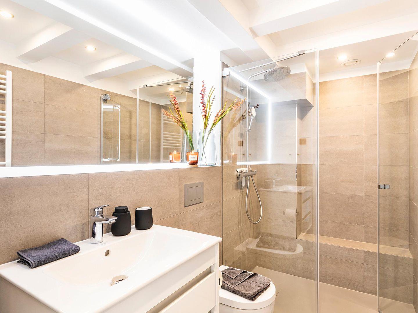 Die Einrichtung ist stilvoll hochwertig und in hellen Sandtönen gehalten.