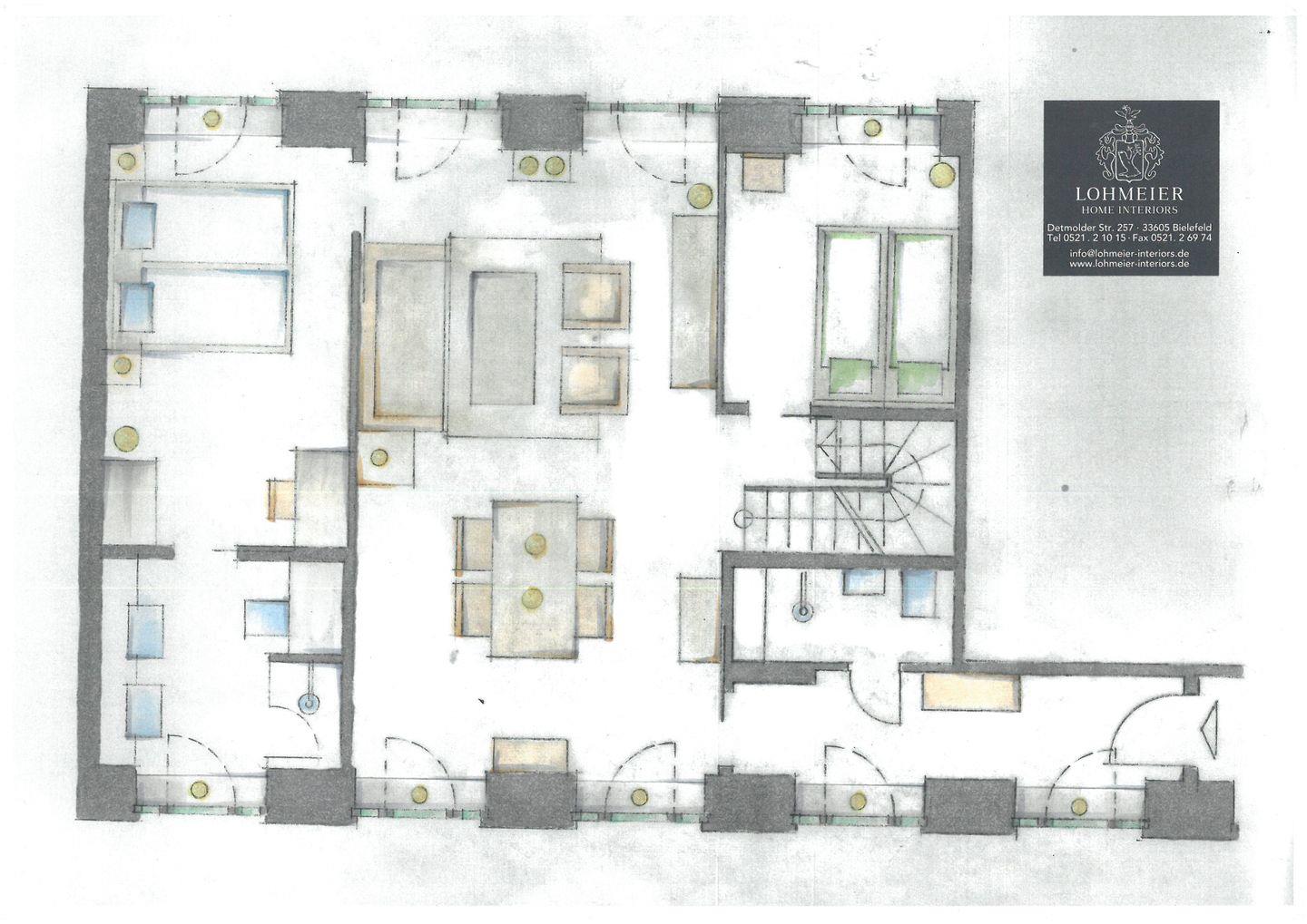 - Wohnbereich/Essbereich: Sofa, TV, Treppenaufgang zur Dachterrasse, Zugang zum Balkon