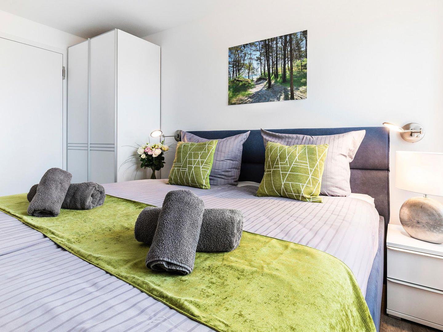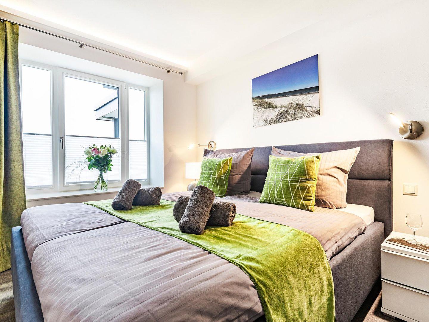 In der gemütlichen Wohnung, mit W-LAN und Fußbodenheizung, stehen Ihnen für Ihren Schlafkomfort zwei Schlafzimmer mit jeweils einem Doppelbett für 2 Personen zur Verfügung . Der zentrale Wohn-Essbereich bietet ausreichend Platz für vier Personen am großen Esstisch sowie auf der bequemen Couch. Der meerseitige Balkon verfügt über einen Tisch und Stühle, die ebenfalls zum Verweilen oder gemeinsamen Essen einladen, das Sie in der vollausgestatteten Küche selbst zubereiten können.