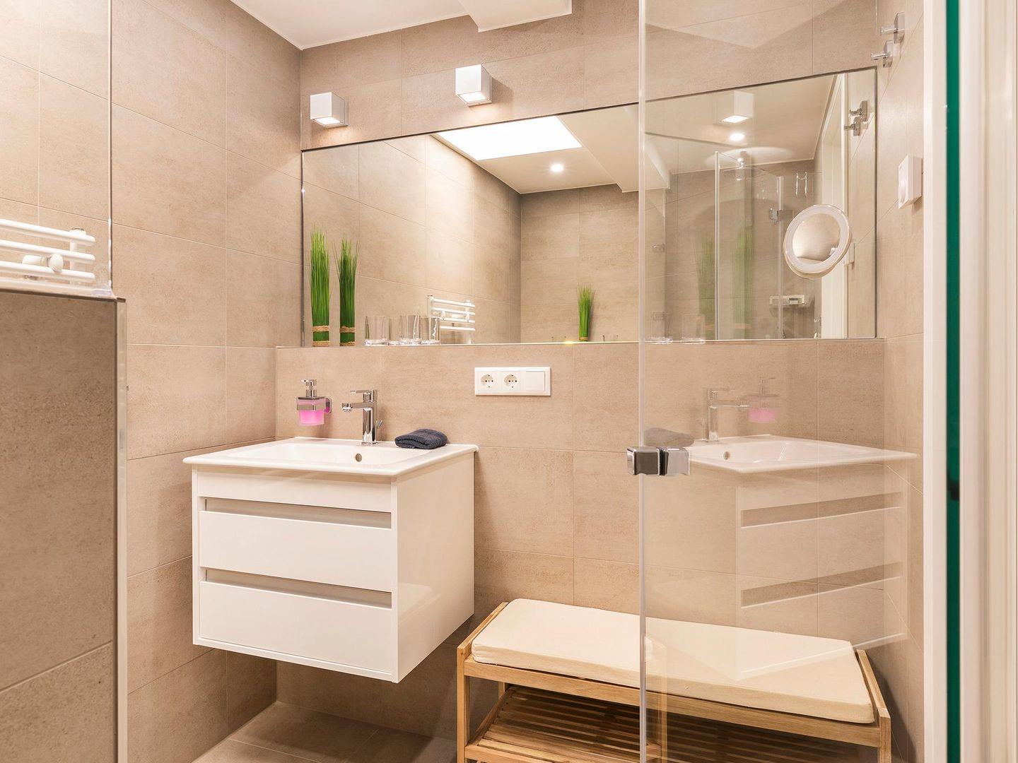 - Großes Badezimmer 1: Sauna, Regendusche, WC, Haartrockner, Sitzhocker